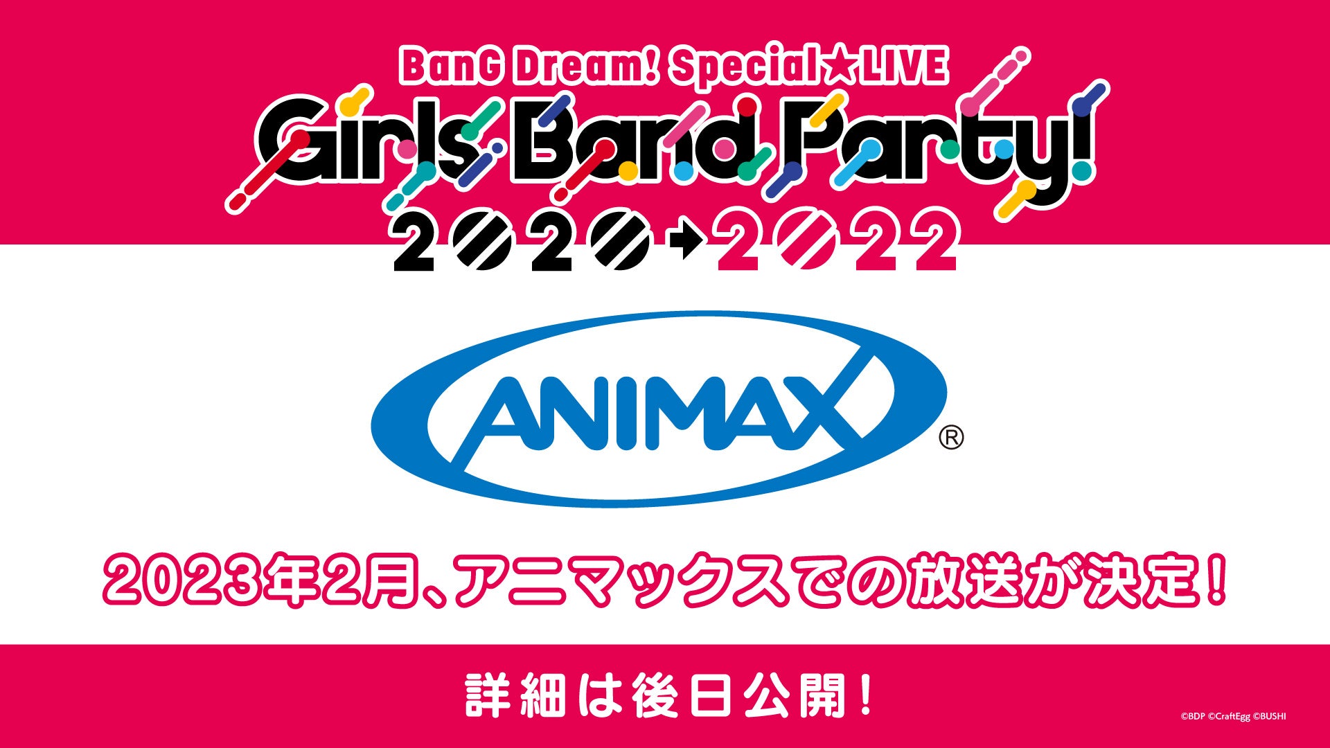 「アニマックス」にて、「BanG Dream! Special☆LIVE Girls Band Party! 2020→2022」の模様が、2023年2月に最速放送されることが決定しました。詳細は後日の発表をお待ちください。