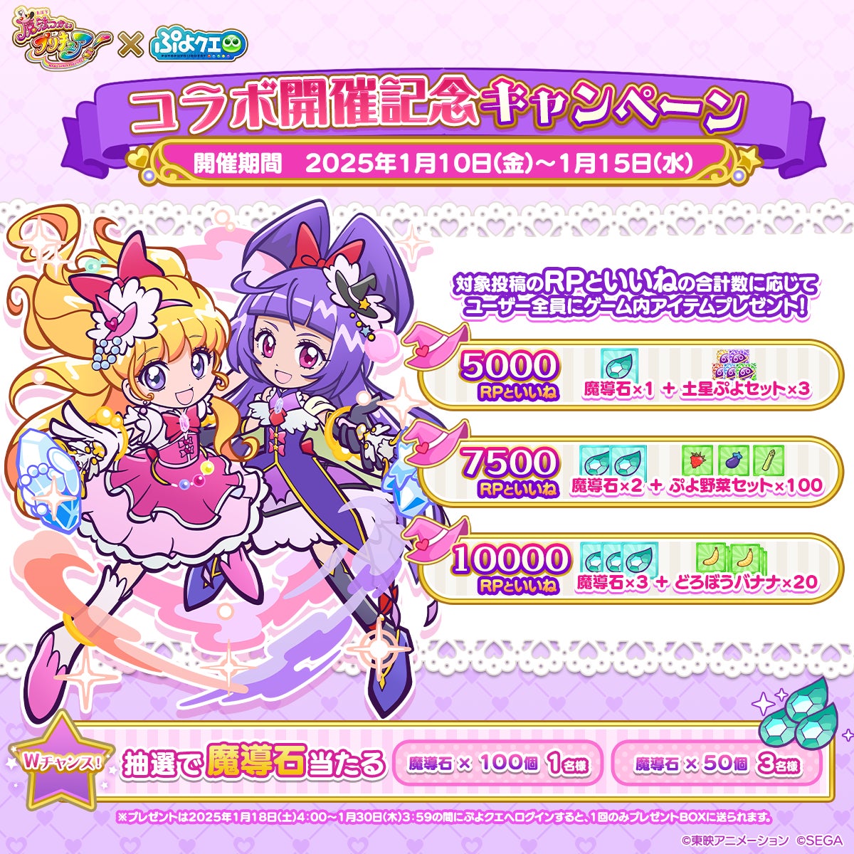内容:『ぷよぷよ!!クエスト(ぷよクエ)』公式Xアカウントと公式Instagramアカウントにて「コラボ開催記念キャンペーン」を開催いたします。対象投稿のPR(リポスト)といいねの合計数に応じてユーザー全員にゲーム内アイテムをプレゼントいたします。また、キャンペーンにご参加いただいた方の中から抽選でWチャンスとして魔導石をプレゼントいたします。ぜひ、ご参加ください。