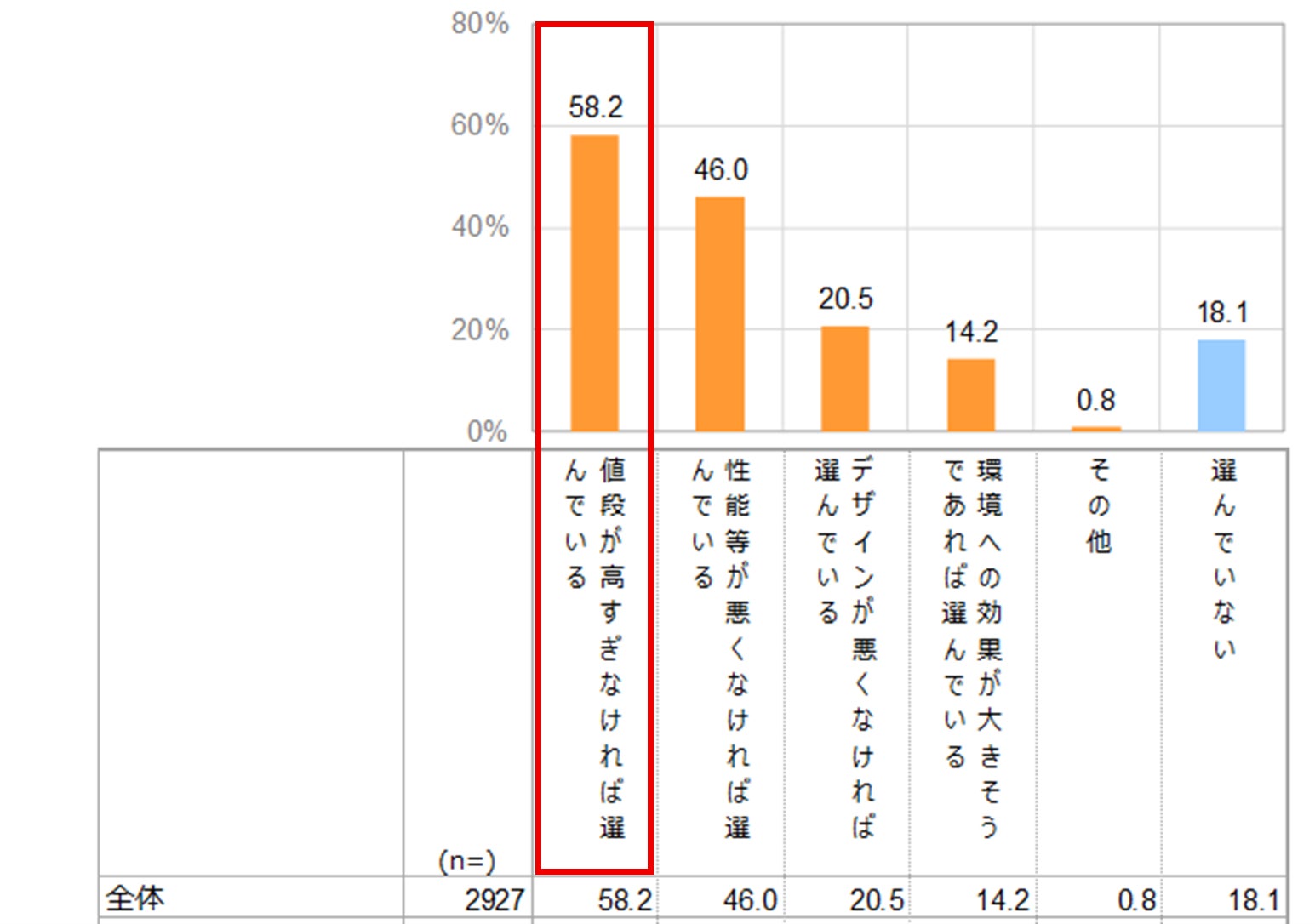 ・「値段が高すぎなければ選んでいる」(58.2%)が最も高く、続いて「性能等が悪くなければ選んでいる」(46.0%)、「デザインが悪くなければ選んでいる」(20.5%)となっている。