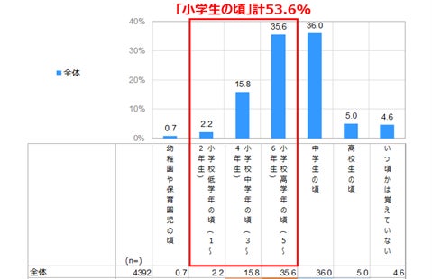 ・「小学生の頃」計が53.6%と最も高く、続いて「中学生の頃」(36.0%)、「高校生の頃」(5.0%) となっている。
