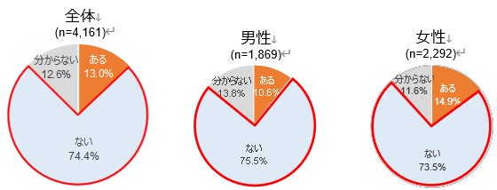 ・性別で見ると、男性・女性ともに「ない」が最も高くなっているが、「ある」と回答した男性は10.6%、女性は14.9%と、女性の方が男性より4.3ポイント高くなっている。