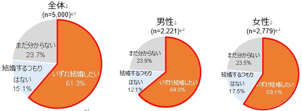 ・全体では、「いずれ結婚したい」(61.3%)が最も高く、続いて「まだ分からない」(23.7%)、「結婚するつもりはない」(15.1%)となっている。