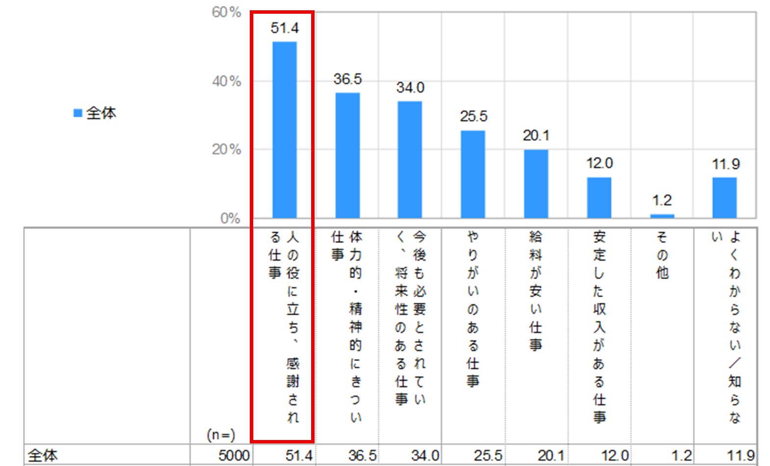 ・「人の役に立ち、感謝される仕事」(51.4%)が最も高く、続いて「体力的・精神的にきつい仕事」(36.5%)、「今後も必要とされていく、将来性のある仕事」(34.0%)となっている。