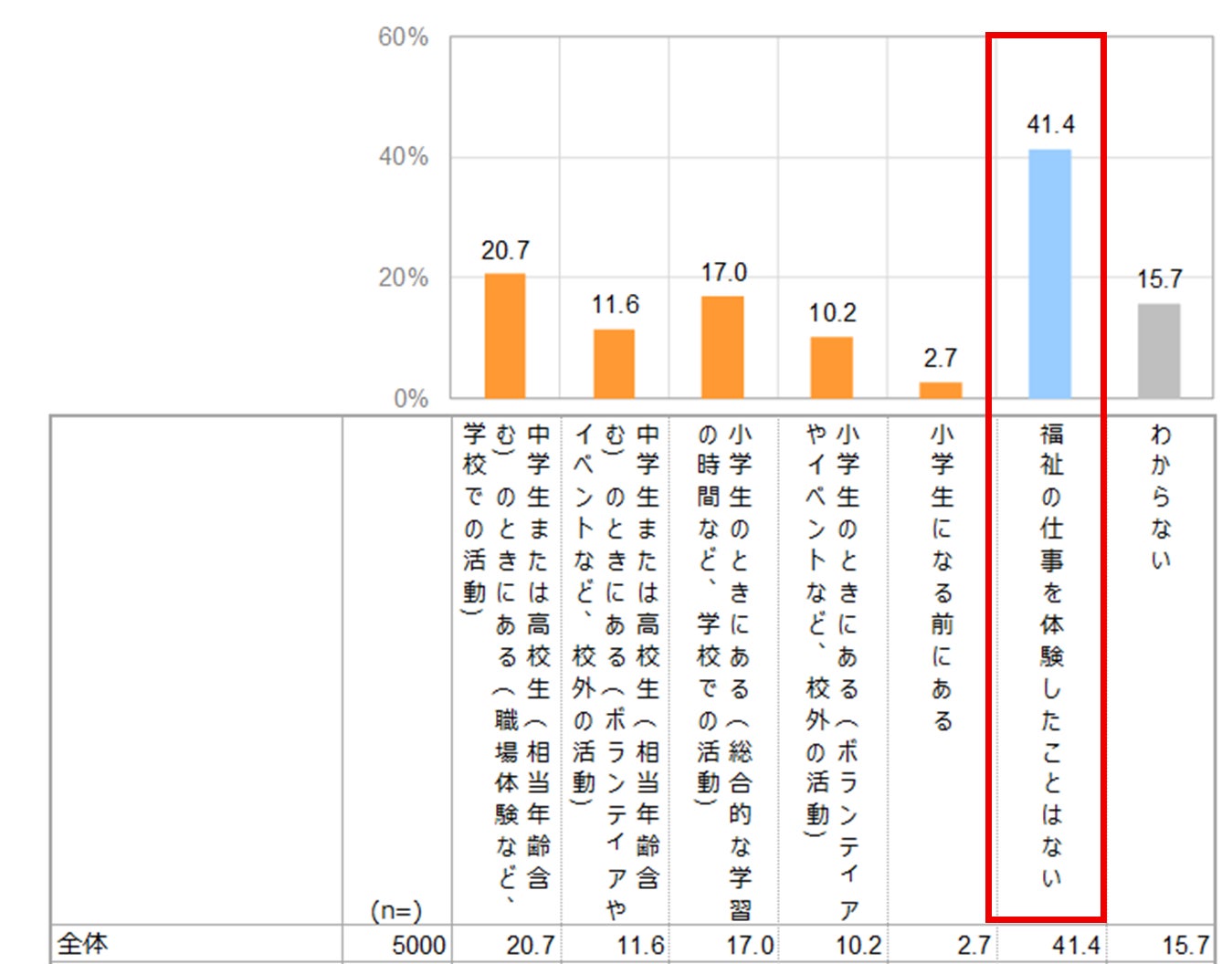 今までに、福祉の仕事を体験したことはありますか。福祉の仕事には、例えば、高齢者の介護・障害者の支援・保育などが含まれます。(複数回答可)