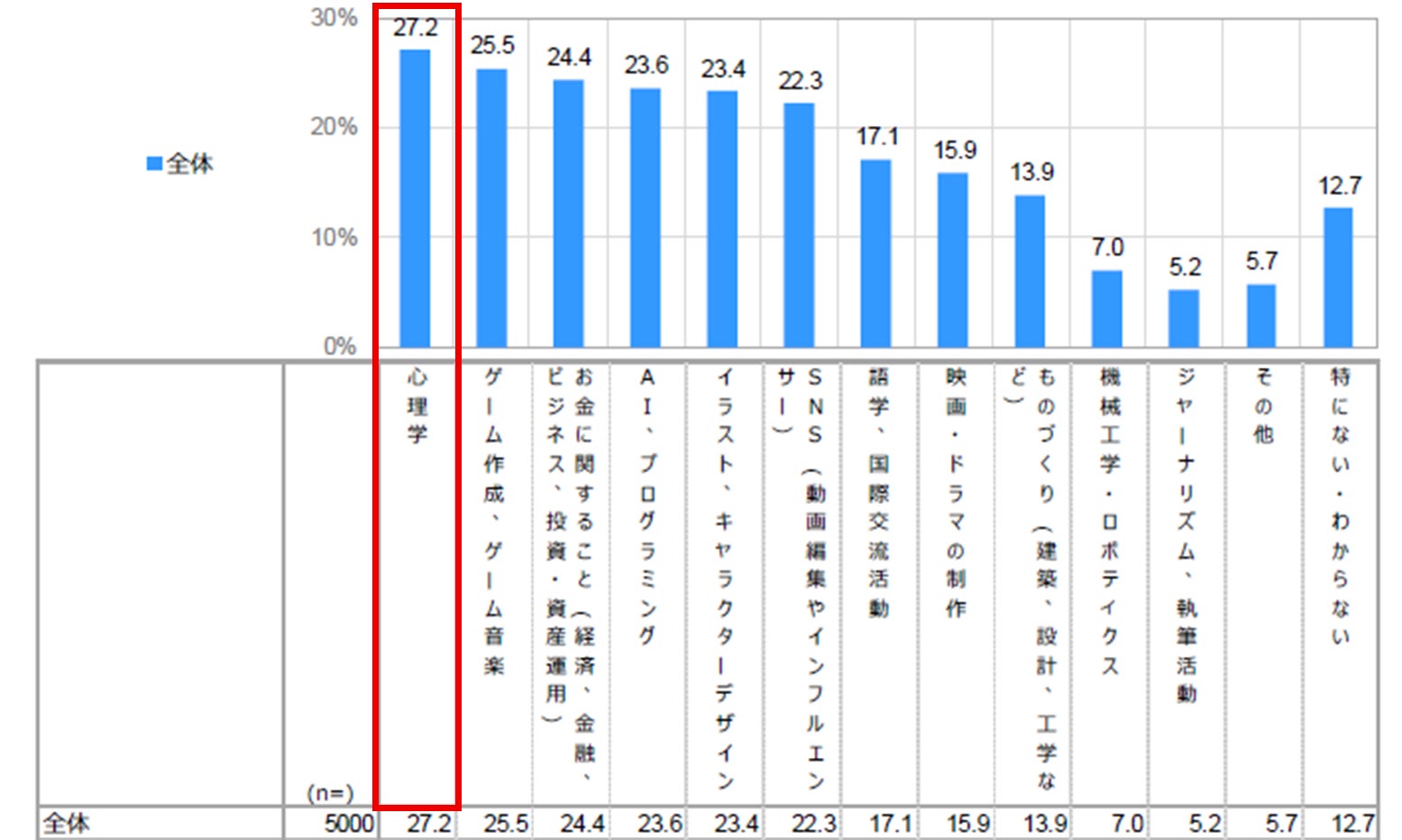 ・「心理学」(27.2%)が最も高く、続いて「ゲーム作成、ゲーム音楽」(25.5%)、「お金に関すること(経済、金融、ビジネス、投資・資産運用)」(24.4%)となっている。