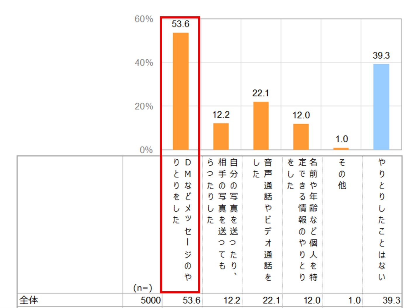 ・「DМなどメッセージのやりとりをした」(53.6%)が最も高く、続いて「やりとりしたことはな い」(39.3%)、「音声通話やビデオ通話をした」(22.1%)となっている。