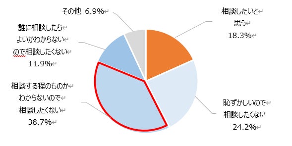 ・「相談する程のものかわからないので相談したくない」(38.7%)が最も高く、続いて「恥ずかしいので相談したくない」(24.2%)、「相談したいと思う」(18.3%)となっている。