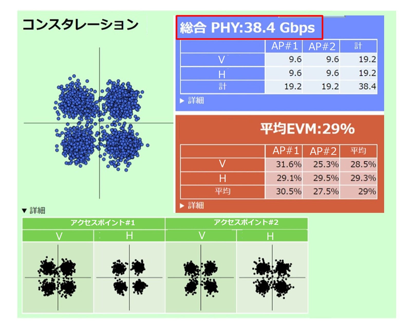 これにより、2台の中継デバイスを用いてAPまで5 mの電波暗室環境でQPSK(※5)信号による物理伝送速度38.4 Gbpsの伝送を実証しました。また、信号減衰量を調整しAPまでの伝搬距離約200 m相当の環境まで物理伝送速度38 Gbpsの伝送を実現できることを確認しました。また、実用性の検証として、誤り訂正符号化(LDPC符号化)を用いて通信信頼性を向上させることによりアプリ通信速度14.8 GbpsのIP通信を実現し、4K非圧縮リアルタイム映像の伝送実験に成功しました。