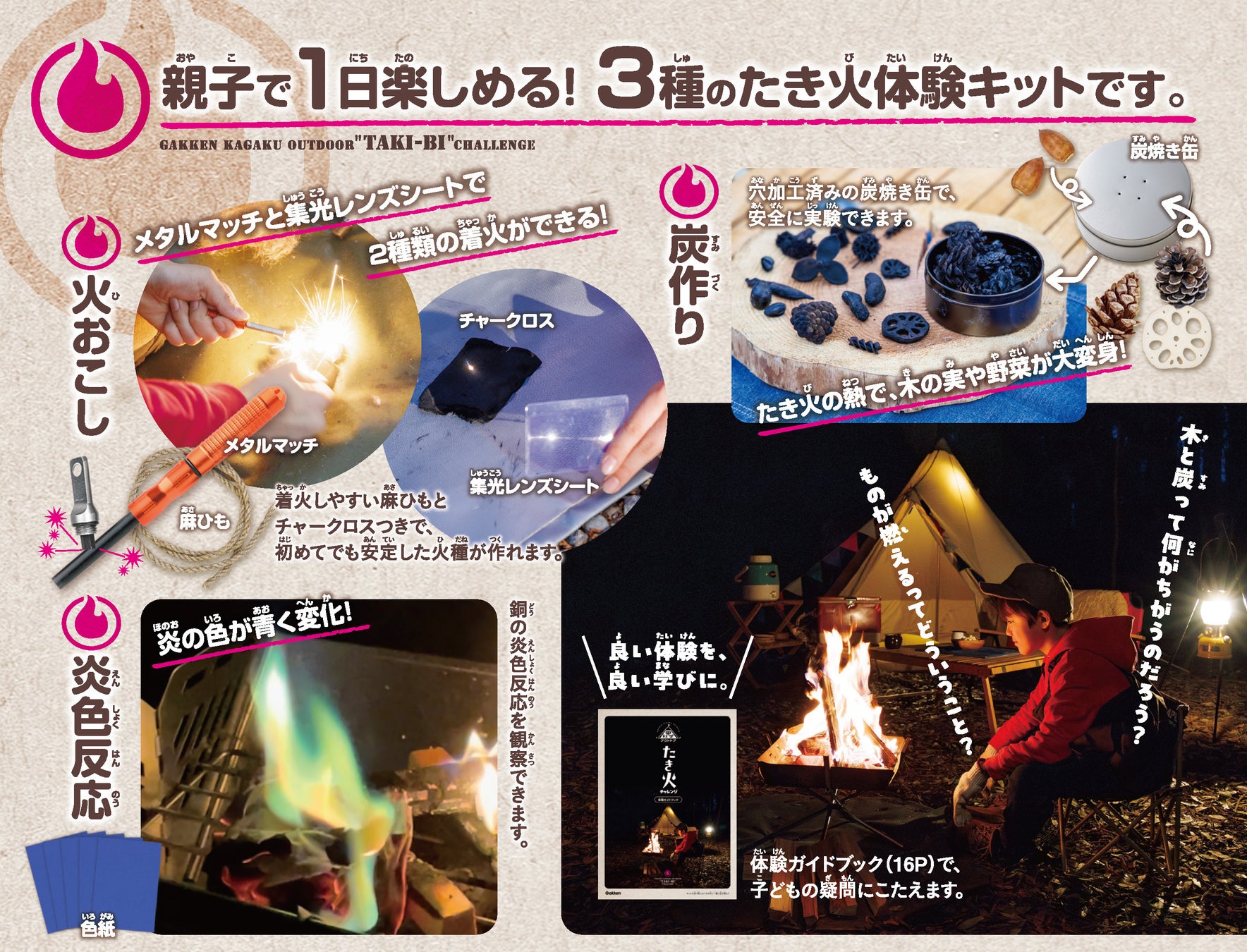 キットの箱の中には、16ページの体験ガイドブックが入っており、それぞれの実験手順をわかりやすく説明、さらに動画でもキットの使い方がよくわかります。ブックの中には、基本の火の育て方、いろいろな着火方法、炎色反応のしくみ、炭とは何か? などのコラムも充実しており、体験と共に知識が身に付く工夫がされています。