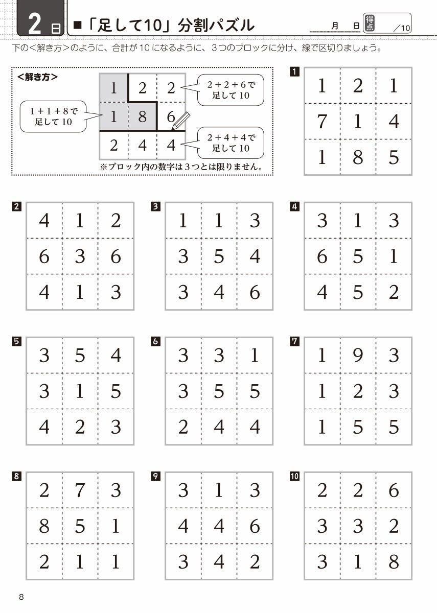 しりとり計算、合計10分割、リレー計算、スピード足し算、コイン足し算、計算クロス、穴あき計算パズル、三角パズル、4コーナー計算、+-符号パズルなど、多種多様な算数パズル【15種1,960問】を収録しました。毎日、飽きずに楽しめます。