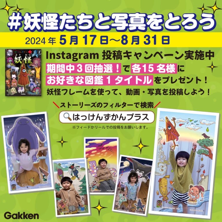 株式会社 学研ホールディングス(東京・品川/代表取締役社長:宮原博昭)のグループ会社、株式会社 Gakken(東京・品川/代表取締役社長:五郎丸徹)は、2024年5月17日(金)より、『はっけんずかんプラス 妖怪』オリジナルInstagramエフェクト(フォトフレーム)を利用した投稿キャンペーンを開催中です。