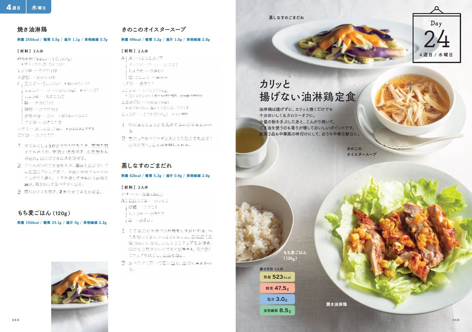 また、その献立内容、実は実際にこの献立にチャレンジした、91歳と54歳の2人の食いしん坊のリクエストに沿ったものなのです。なので、ただ単に「ヘルシー」なものとなっていません。餃子やグラタン、油淋鶏など、我慢しすぎなくてもいい内容になっています。