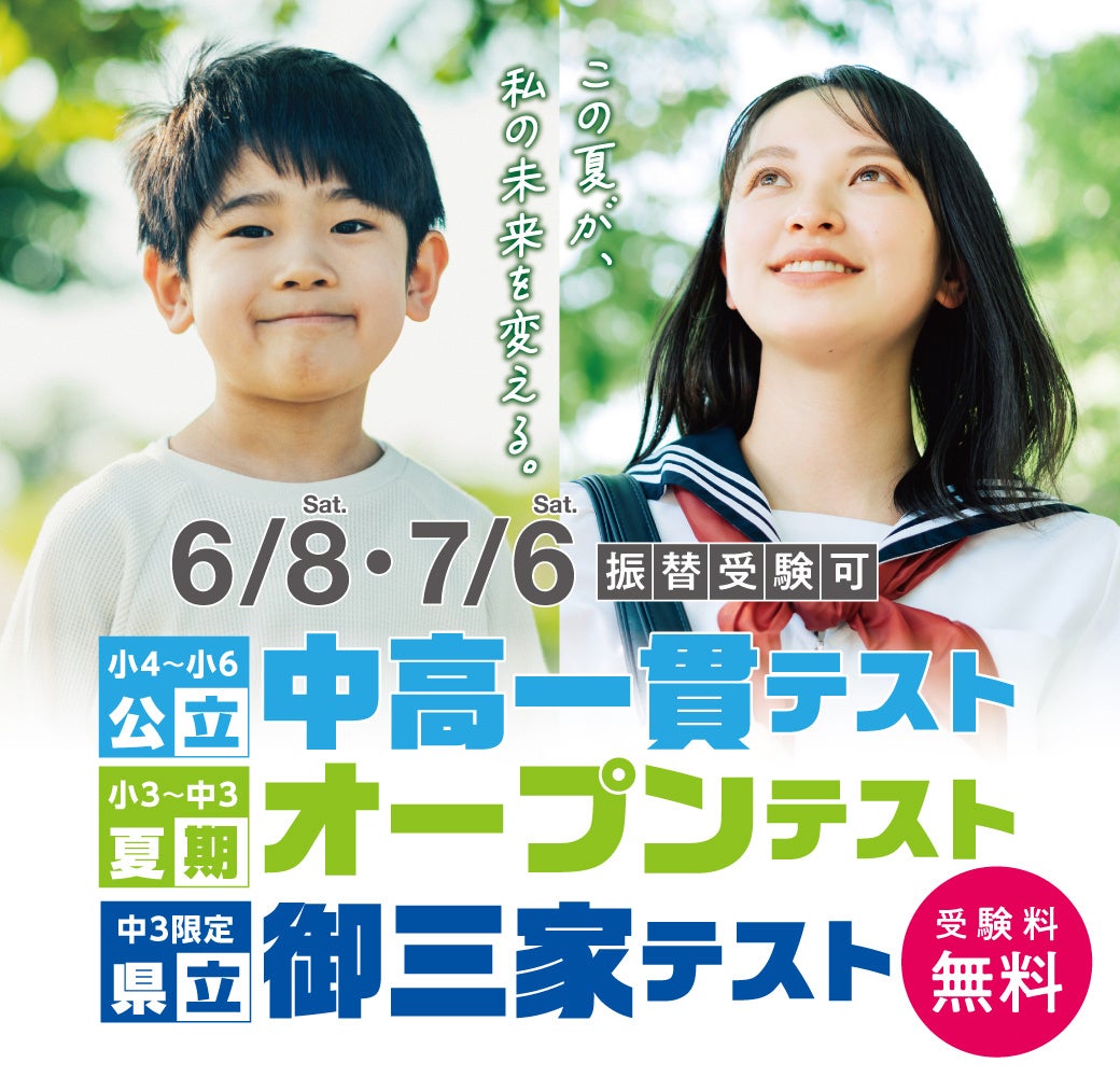 ここまでの学習の定着確認に『夏期オープンテスト』、川口市立高校附属中・大宮国際中・市立浦和中・伊奈学園中を目指すなら『中高一貫テスト』、浦和・大宮・浦和一女を目指す中3生は『県立御三家テスト』