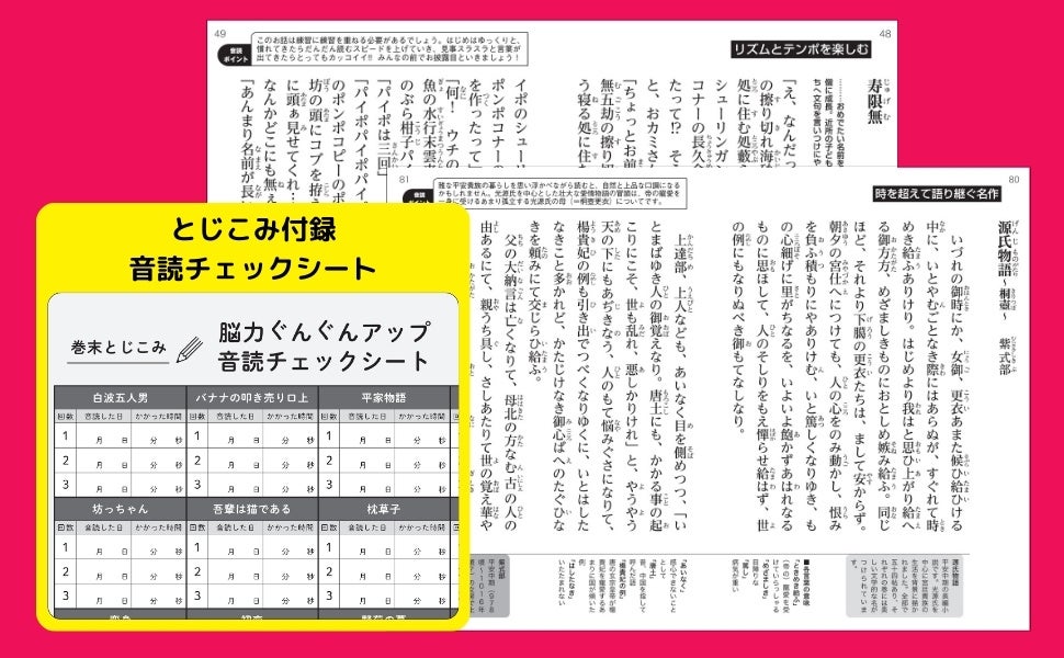 1作品につき3回分の音読タイムを記録できる「脳力ぐんぐんアップ 音読チェックシート」つき。