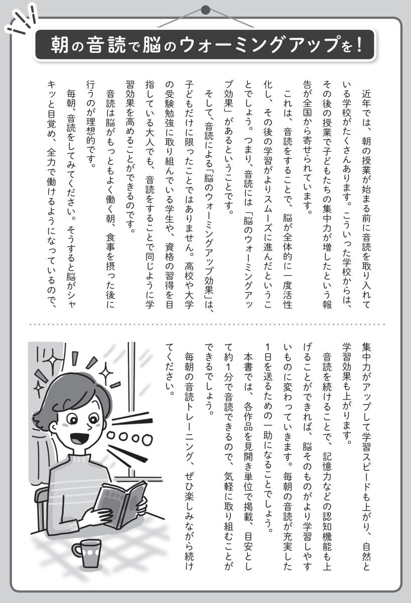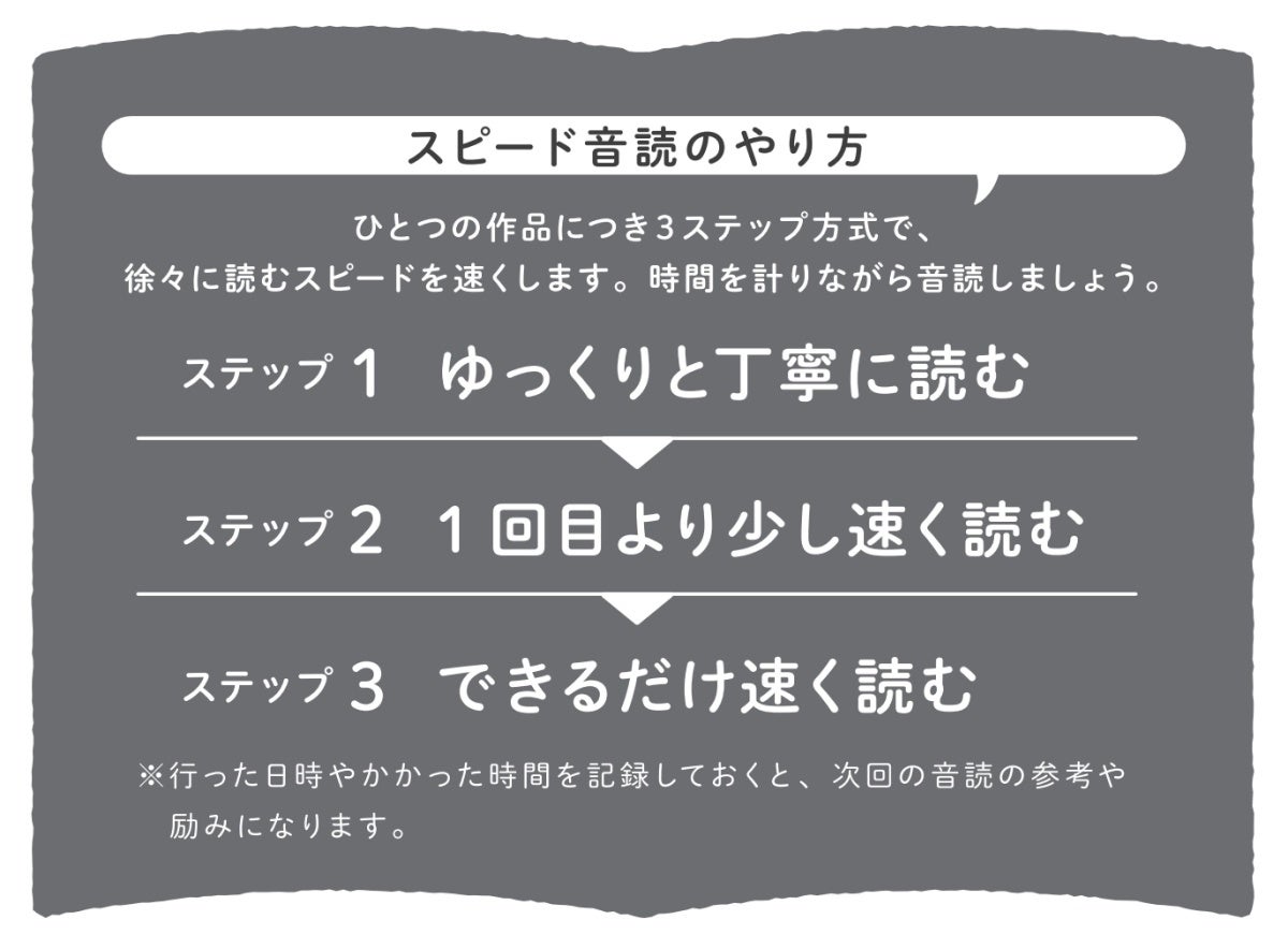 本書では、記憶力と集中力がさらにアップする【スピード音読】のやり方を解説。「声に出して読んでみたい」と思える作品を幅広く掲載しました。