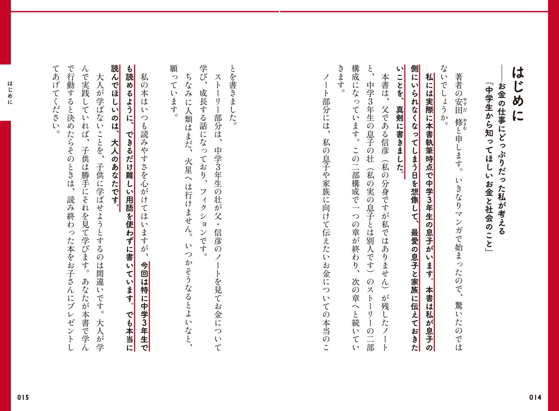 実生活でも中学生の息子を持つ安田氏が、実際に息子に話したり、息子から質問を受けたりと、親子の対話の中で出てきた「お金の話」も多数盛り込みながら、大人が読んでも発見の多い内容となっています。