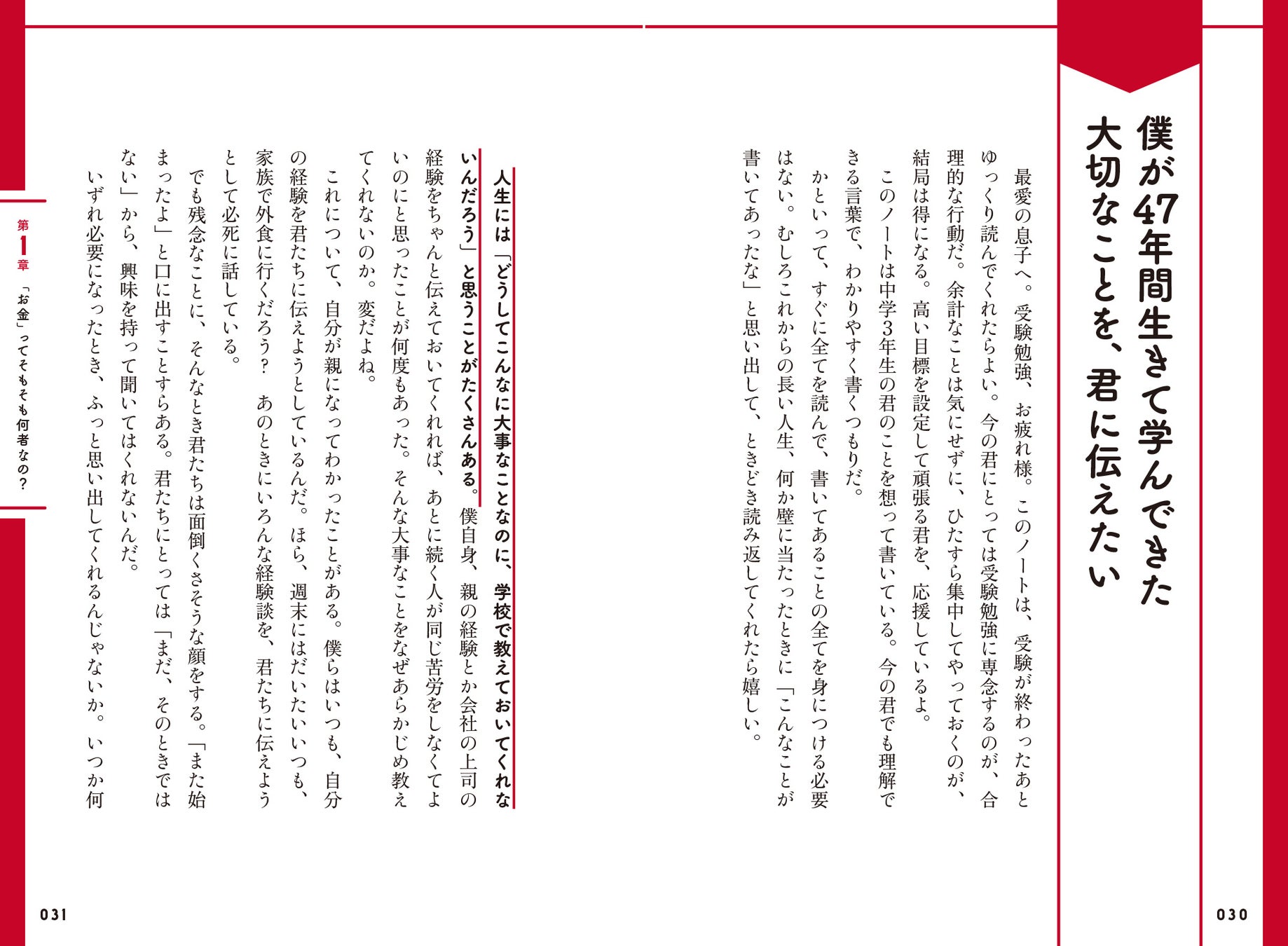 本書は、『自分を変えるノート術』『お金が増えるノート術』など、「ノート」をテーマとした著書でベストセラーを連発している安田氏が、息子に向けて書き残した「ノート」という設定。父親が息子に優しく語り掛ける文体で、中学生が読んでも理解できるように「一番大切なお金のこと」を綴っています。