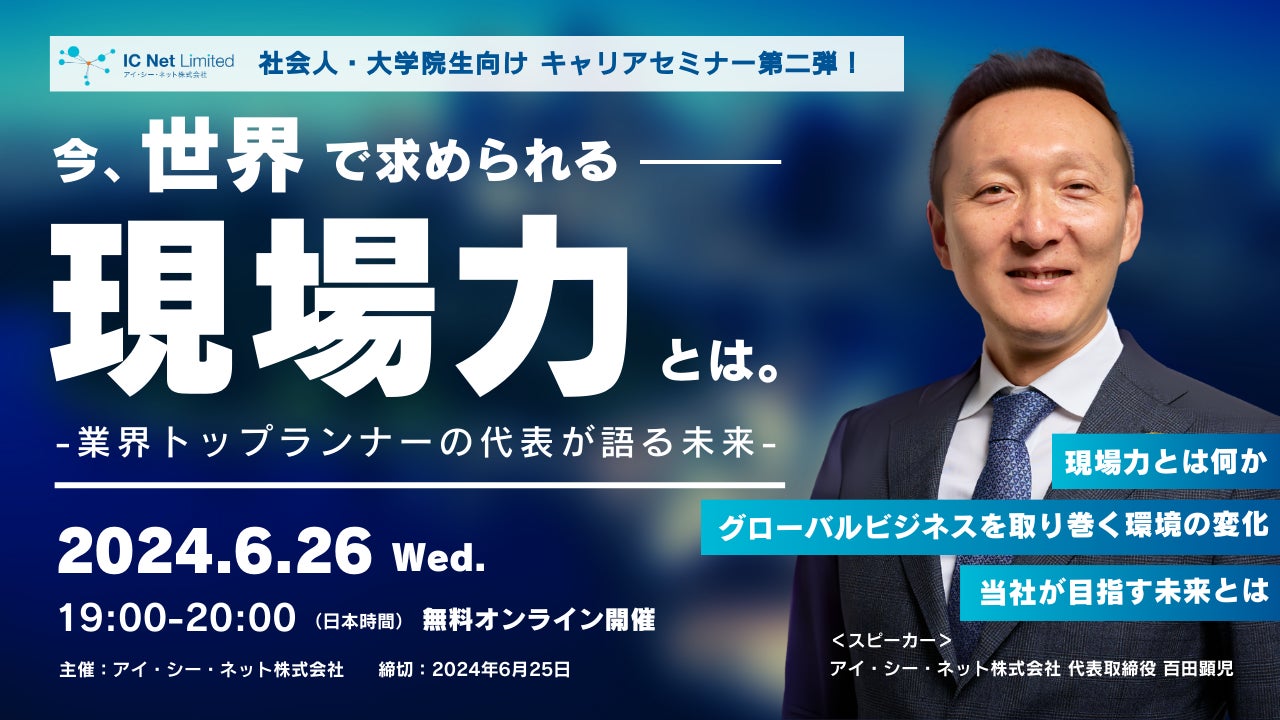 株式会社 学研ホールディングス(東京・品川/代表取締役社長:宮原博昭)のグループ会社、アイ・シー・ネット株式会社(埼玉/代表取締役:百田顕児、以下アイ・シー・ネット)は、2024年6月26日(水)に社会人向けキャリアセミナー「今、世界で求められる現場力とは」を開催します。