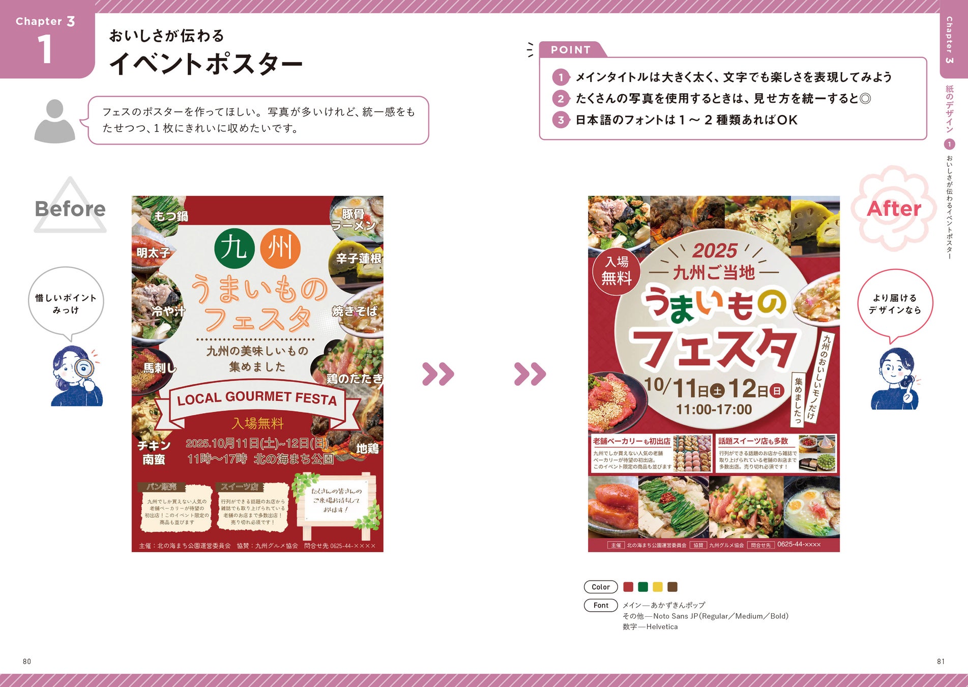 紙とWebの違い、媒体の違いによってデザインの方向性も大きく変わります。本書の第3章と第4章では紙のデザインとWebのデザインそれぞれの制作ポイントを作例を使って解説します。バナーやポスター、名刺、プレゼン資料など実務で制作することの多いデザインの作り方を丁寧に紹介しています。また、デザインとセットで考えたいキャッチコピーや文字組みについても第5章で解説。デザインに困っている、悩んでいる方にとって「お守りになる1冊」です。