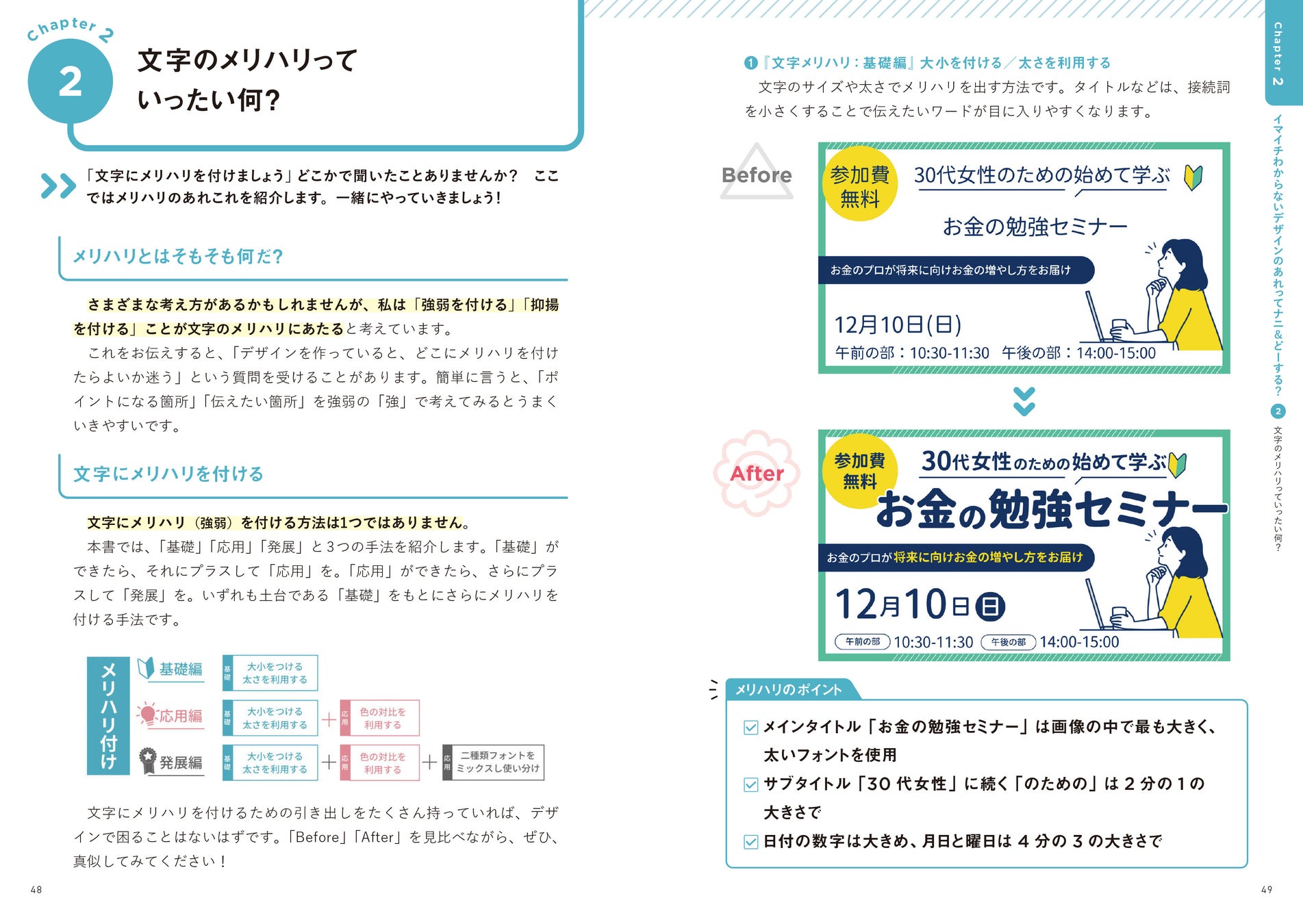 前述した思考法を第1章で学んだら、第2章から、より具体的な悩みや疑問について考えていきます。デザイン制作に携わったことのある人なら経験したことがある「思っていたのと違うと言われる」といった悩みの解決法や、よく耳にする「メリハリを付ける」「抜け感を出す」「世界観を意識する」といった制作テクニックを紹介します。