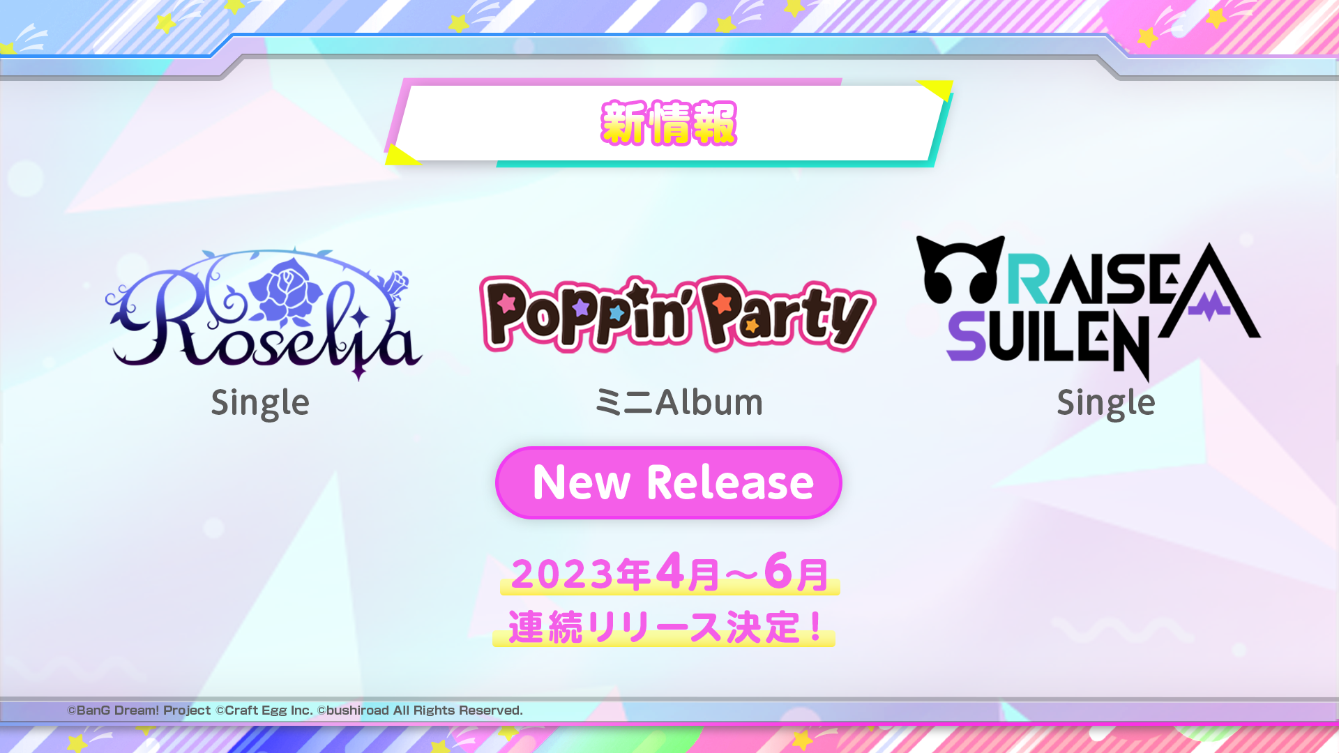 株式会社ブシロードミュージック(本社:東京都中野区、代表取締役社長:根本雄貴)は、本日2022年11月20日(日)にYouTubeにて配信された「バンドリ!発表会 For 2023」において発表した新規解禁情報を報告いたします。