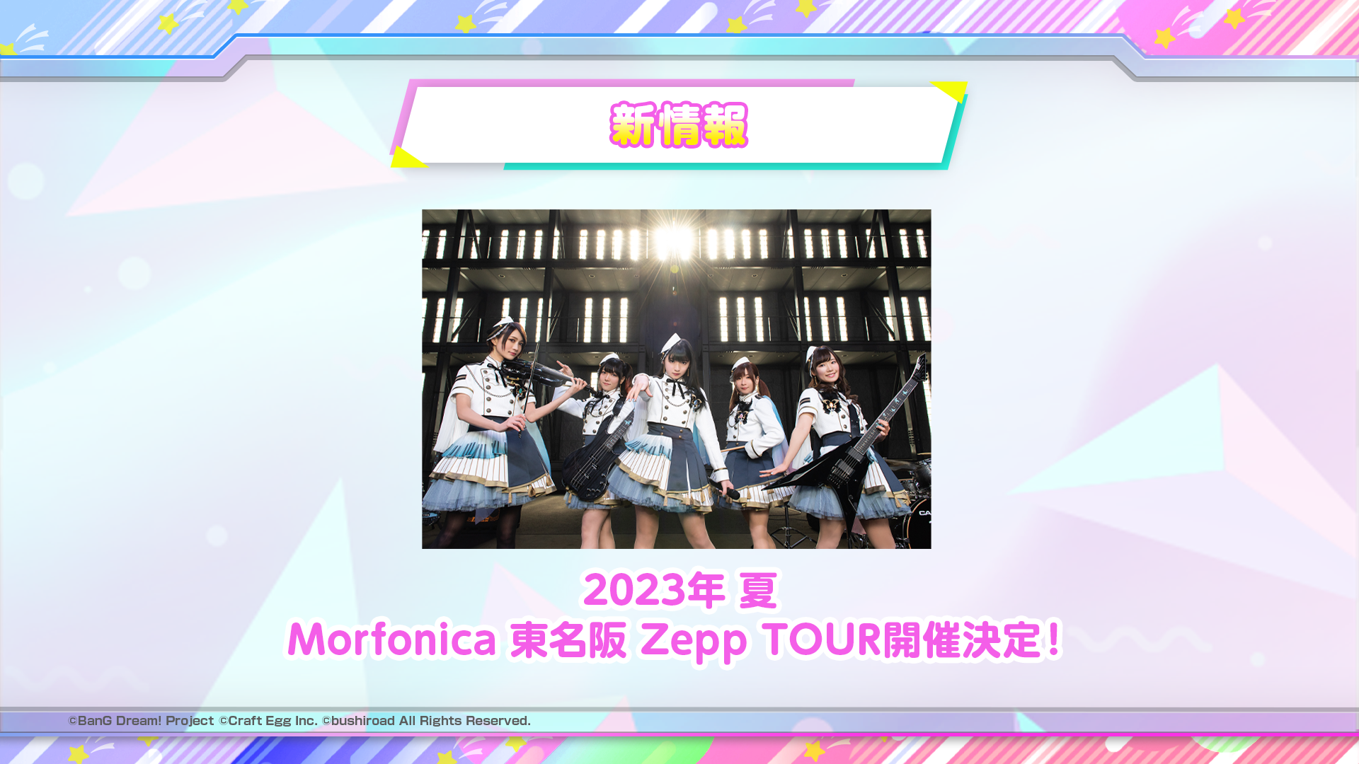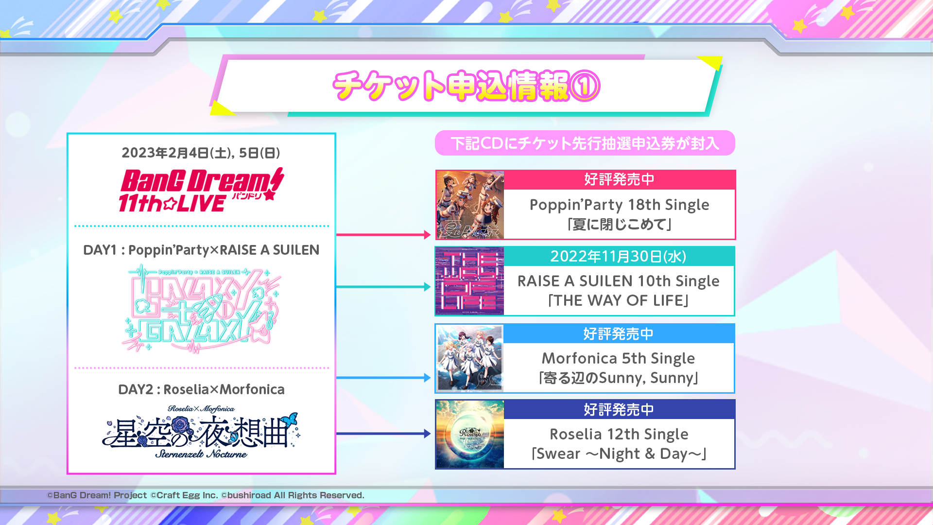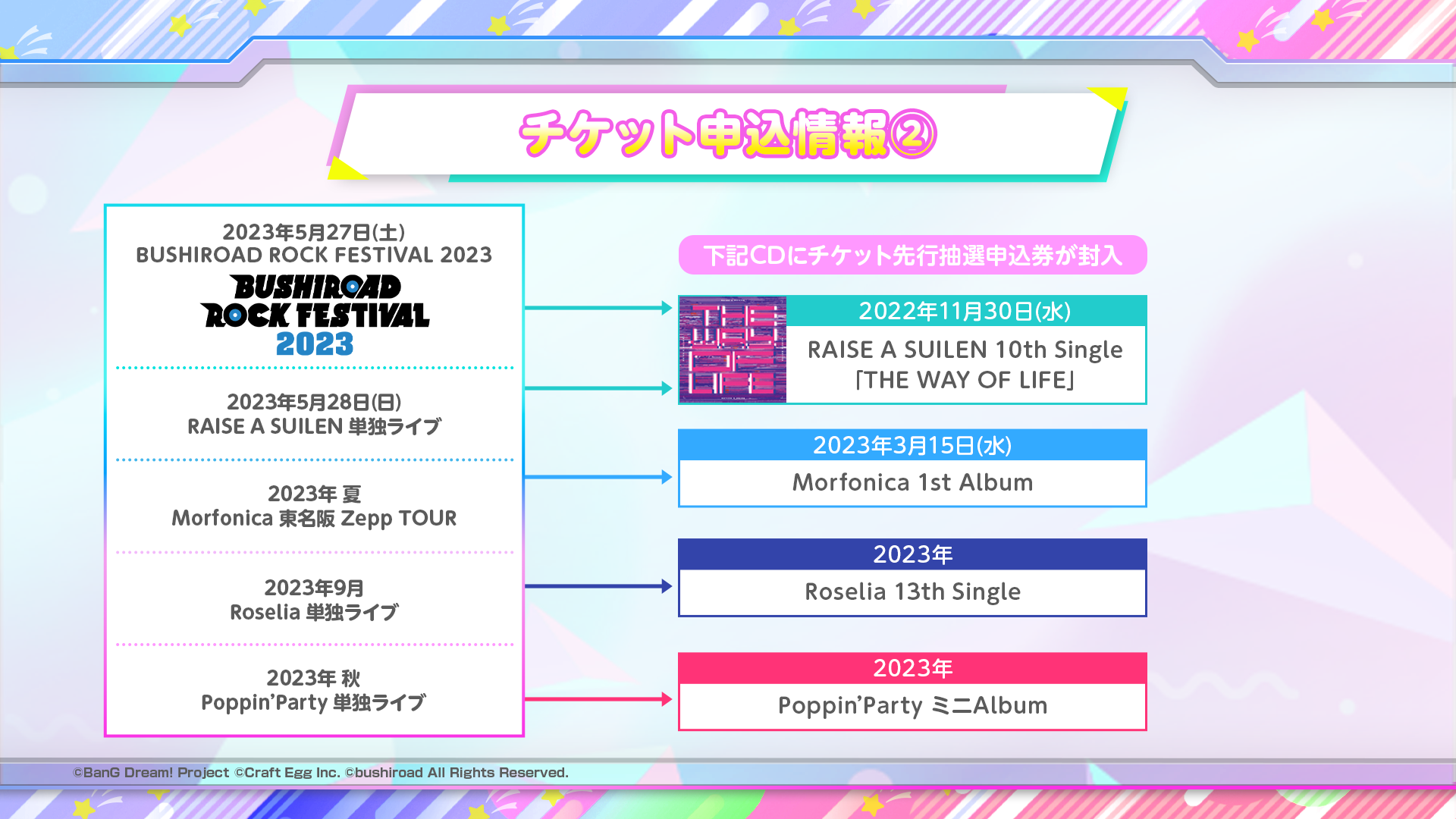 2022年11月13日(日)「ブシロード15周年記念ライブ in ベルーナドーム」終演後に開催が発表された、2023年5月27日(土)開催「BUSHIROAD ROCK FESTIVAL 2023」。バンドリ!プロジェクトからはRAISE A SUILENとMorfonicaが出演。本公演は声出し可の開催が決定しています。