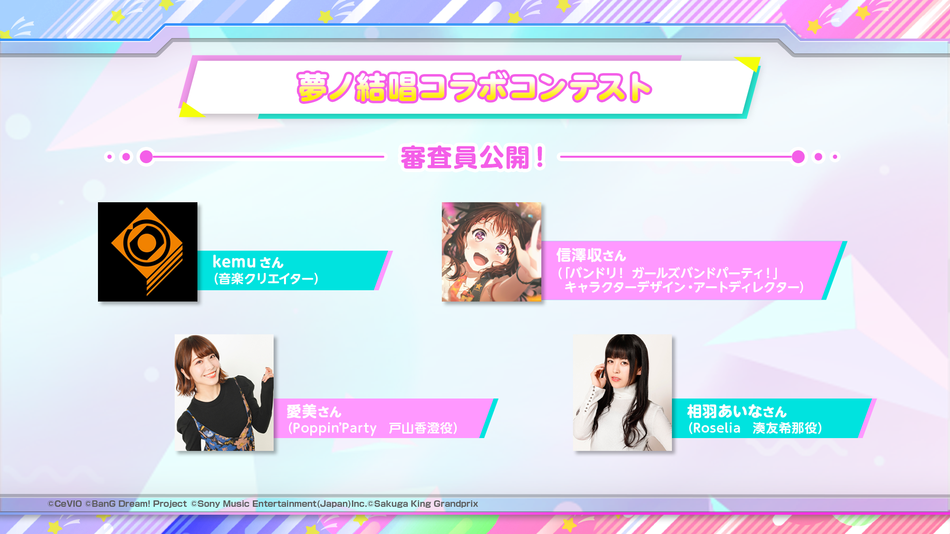 当コンテスト受賞者の楽曲はスマートフォン向けゲーム「バンドリ! ガールズバンドパーティ!」に実装のほか、今後リリースされるアルバムへの楽曲収録などを予定しています。