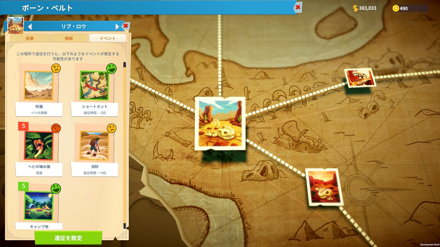 かつて恐竜、あるいは巨大な犬がたくさん暮らしていたと思われるリブ・ロウでは、「恐竜の骨」を発掘することができます。しかし、砂嵐によるヘリの損傷や、ヘビに噛まれて「ヘビ毒」を患ったりと、探索には危険が伴います。貴重な恐竜の骨を発掘したり、危険を回避するために、チームには先史時代専門家を編成しましょう。