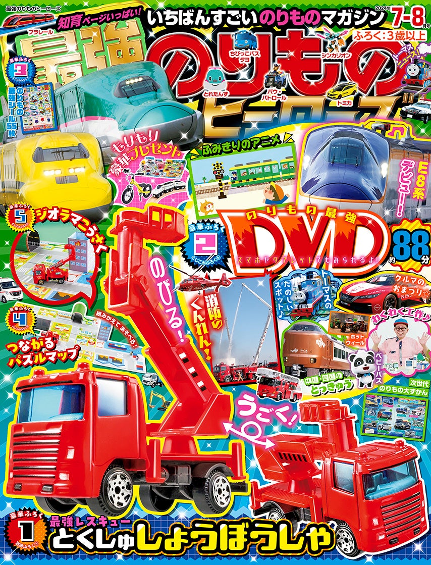 キッズ向けのりもの雑誌『最強のりものヒーローズ7-8月号』は、オリジナルの特殊消防車ミニカーが付録! はしごが伸びたり動いたりと楽しいギミック付きでかっこいい! 道を組みかえて遊べるタウンマップやジオラマ工作付きで、ミニカーと一緒に遊べて楽しいぞ♪