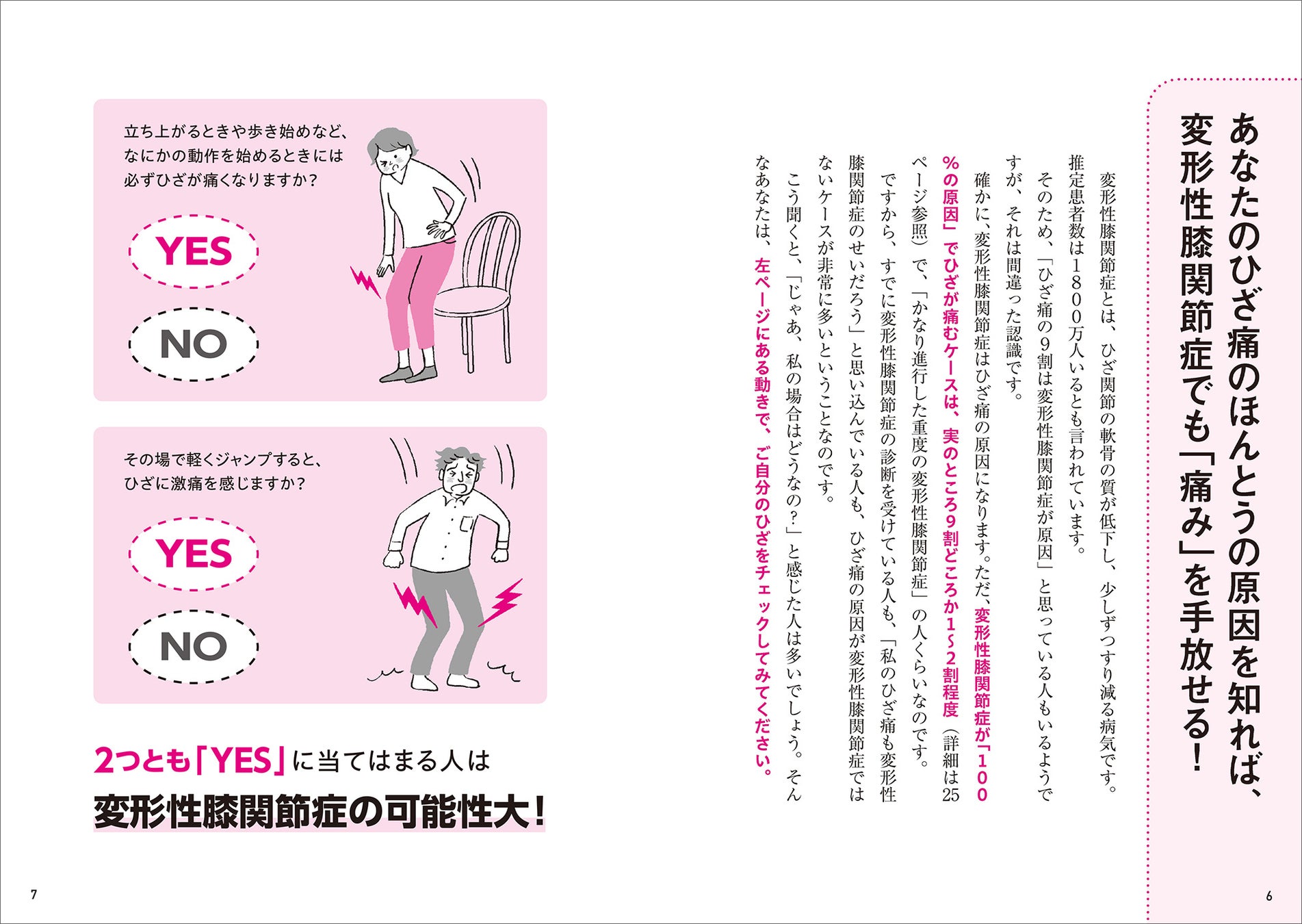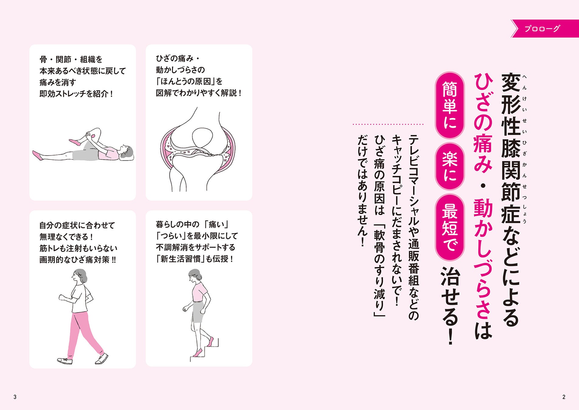 変形性膝関節症によるひざの痛みを消す「特効ストレッチ」や、ひざの違和感を解消する「著効セルフケア」など、普段の痛い、つらいといった症状を「簡単」「楽」「最短」で治すためのコツやノウハウが満載!