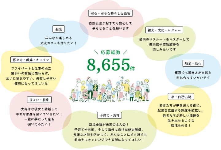 昨年度実施した「#東京で叶えたいこと」を募集するXハッシュタグキャンペーンでは、8,655件と多くの方にご応募をいただき、子育てや安心・安全な暮らしのほか、起業や住まいに関するものなど、多様な声が寄せられました。そうした声や関連する都の施策を特設サイトで紹介しています。