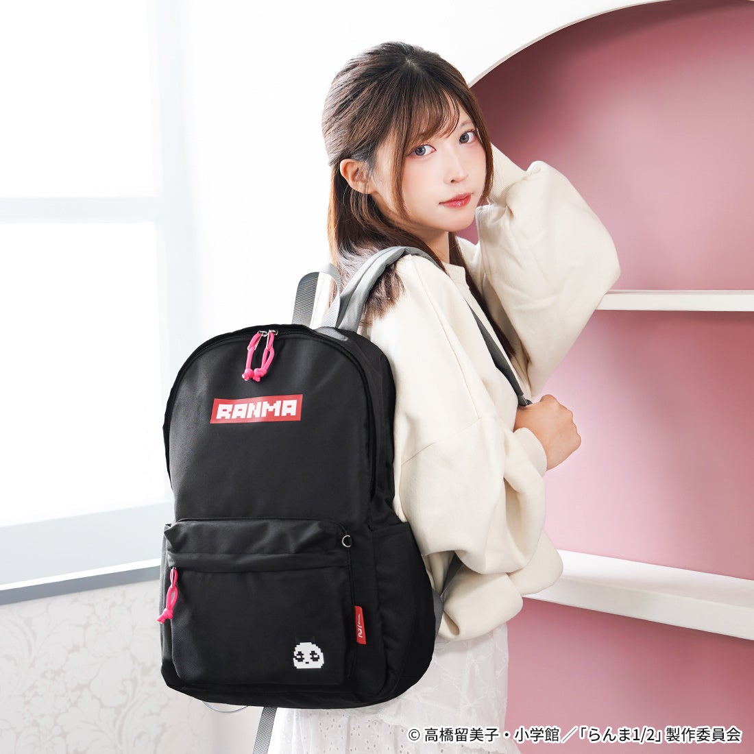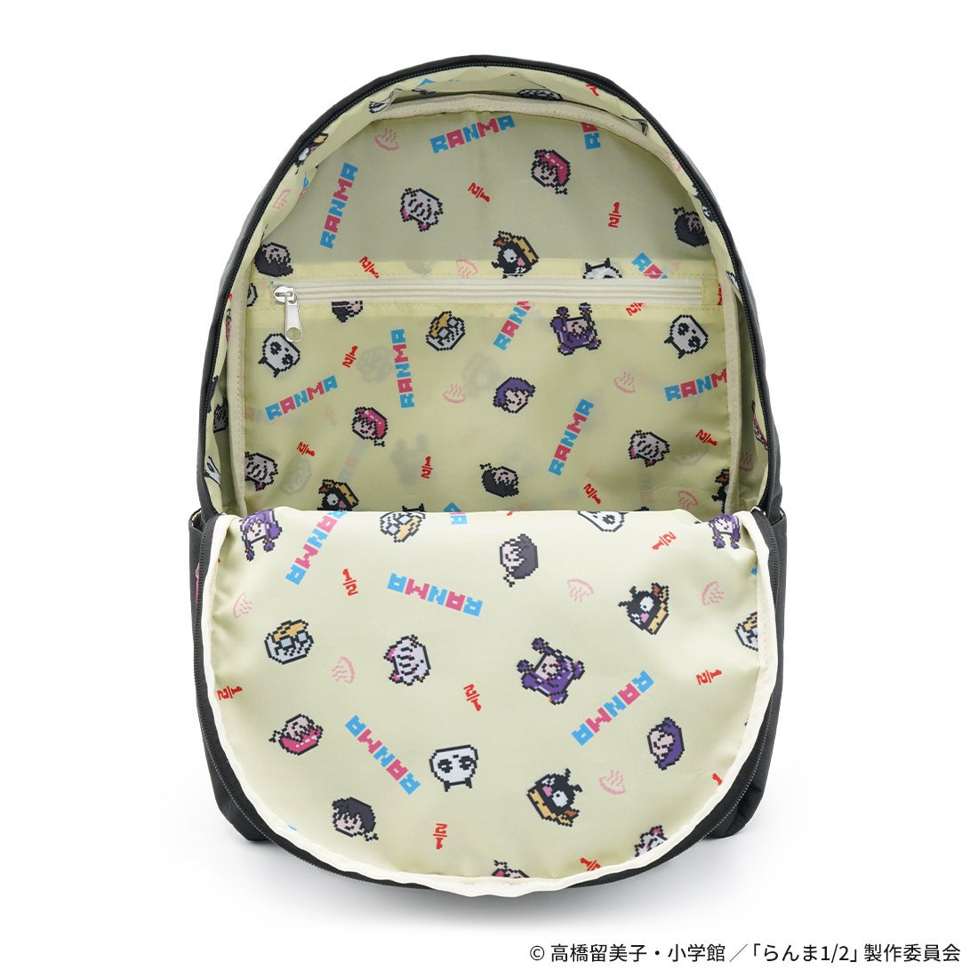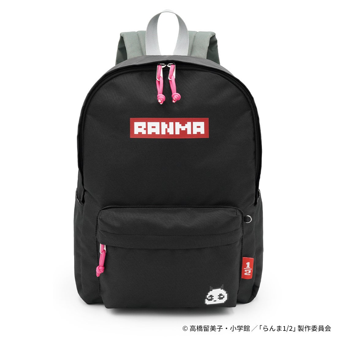 ドットイラストにデザインされた「RANMA」と玄馬(パンダ)をアクセントにした、使い勝手の良いリュック。ファスナーチャームはピンクで統一。