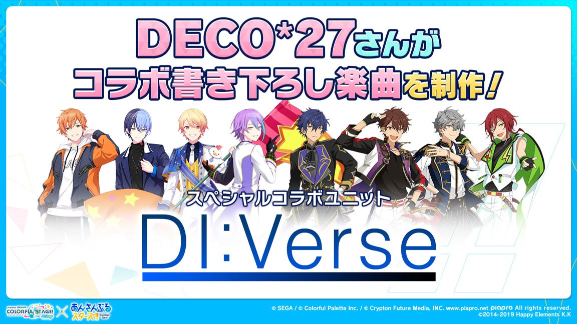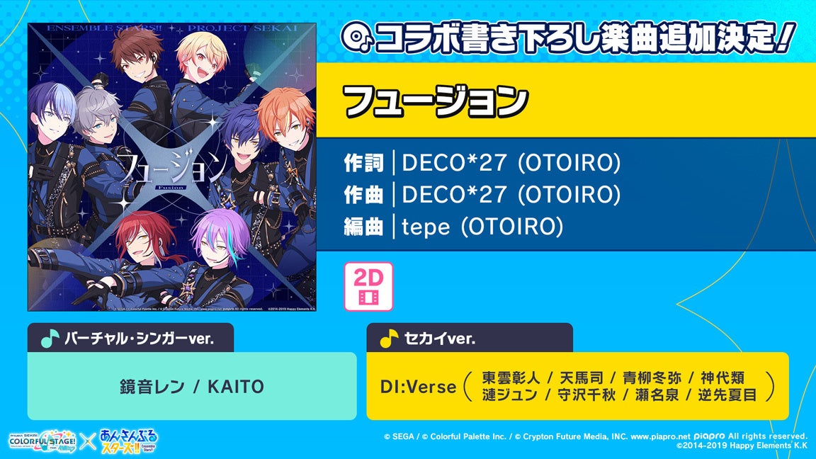 『プロセカ』と『あんスタ!!』のコラボ書き下ろし楽曲として、DECO*27さんによる「フュージョン」の追加が決定いたしました。今後、新たなリズムゲーム楽曲として、コラボキャラクターとなる、東雲彰人、天馬司、青柳冬弥、神代類、漣ジュン、守沢千秋、瀬名泉、逆先夏目の8名によるユニット「DI:Verse」(読み:ディバース)が歌うセカイver.と、鏡音レンとKAITOが歌うバーチャル・シンガーver. の収録を予定しております。