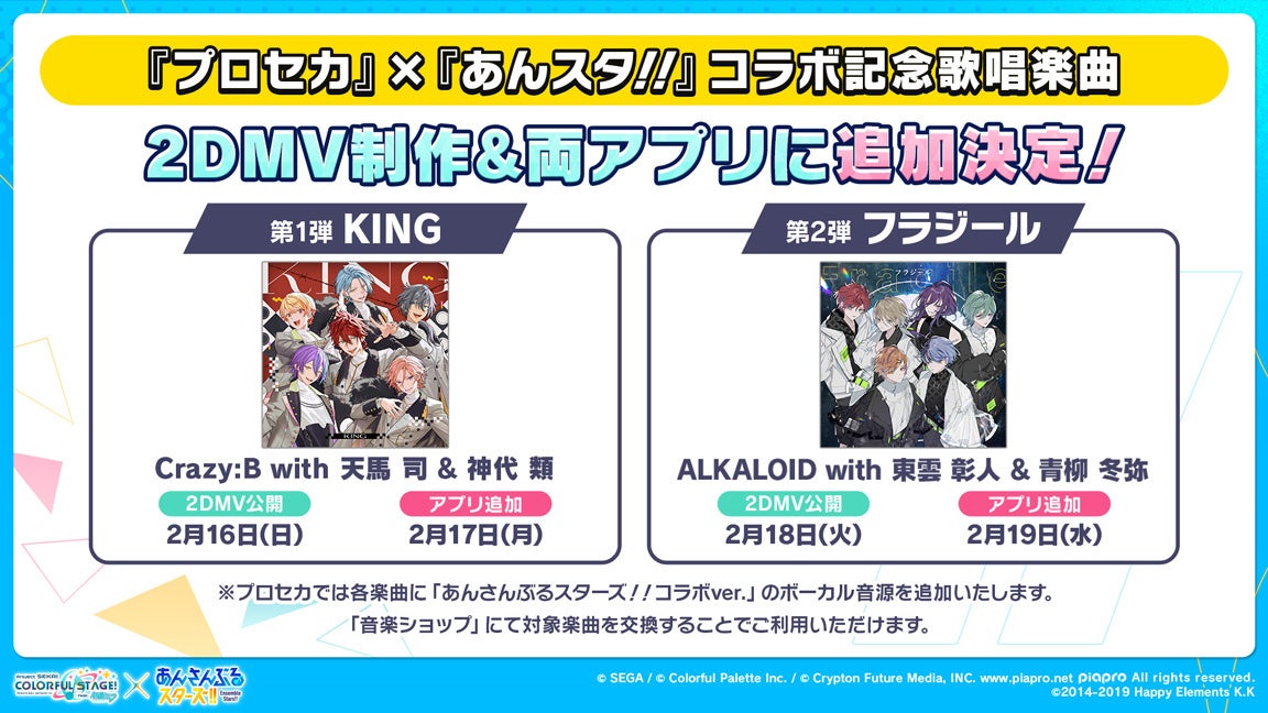 2月16日(日)に、『あんスタ!!』公式YouTubeチャンネル( https://www.youtube.com/@ensemble_stars )にて「KING」を、2月18日(火)に、『プロセカ』公式YouTubeチャンネル(https://www.youtube.com/@pj_sekai_colorfulstage )にて、「フラジール」の2DMVを公開いたします。また、2月17日(月)に「KING」の「Crazy:B with 天馬司&神代類」が歌うあんさんぶるスターズ!!コラボver.、2月19日(水)に「フラジール」の「ALKALOID with 東雲彰人&青柳冬弥」が歌うあんさんぶるスターズ!!コラボver.がゲーム内に追加予定です。