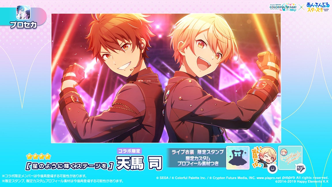本コラボで追加予定の、東雲彰人、天馬司、青柳冬弥、神代類の★4メンバーイラストを公開いたしました。今回のガチャでは、ライブ衣装のほかに、コラボ衣装を着た各キャラクターのイラストが使用された「限定スタンプ」と、各キャラクターのサインをイメージした「限定カスタムプロフィール素材」も付属いたします。