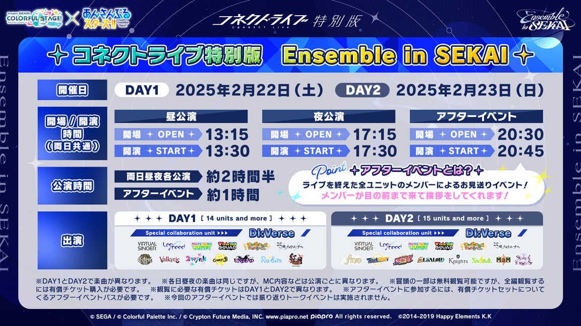『プロセカ』と『あんスタ!!』両アプリの全ユニットが出演する「コネクトライブ 特別版プロジェクトセカイ×あんさんぶるスターズ!!Ensemble in SEKAI」が、2025年2月22日(土)、23日(日)の2日間にわたり、全4公演で開催いたします。『プロジェクトセカイ』の出演メンバーは、すべての公演において、バーチャル・シンガーを含む全ユニットを予定しております。アフターイベントは、1ユニットあたり約3分、計1時間ほどの内容となり、当日の出演順にならってキャラクターが登場いたします。