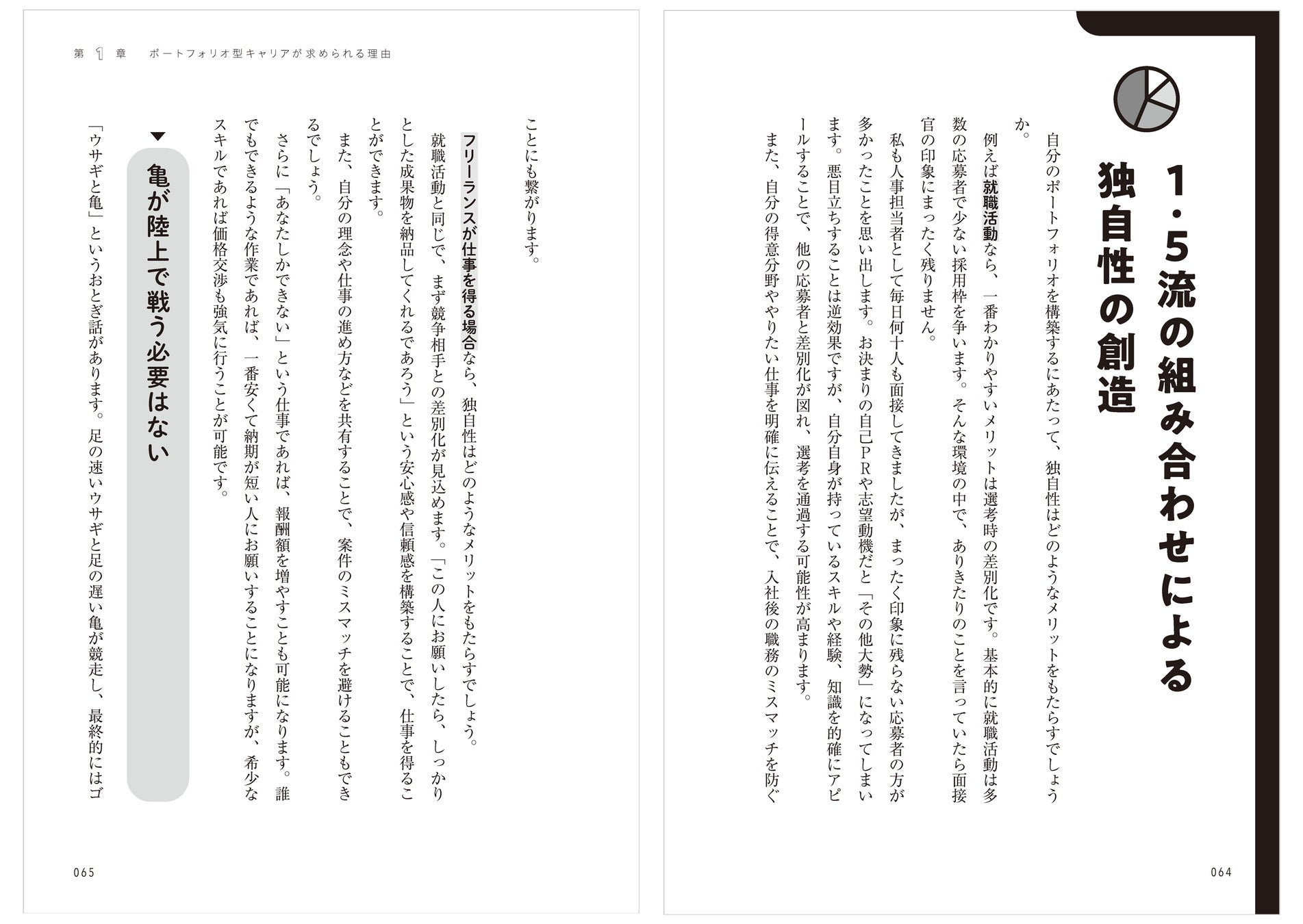 キャリアの棚卸し、仕事に直結する各スキルの獲得方法、情報発信、セルフプロモーション、商業出版ノウハウ、コミュニティ構築法、継続するためのコツなど、さまざまな観点から「独自のポートフォリオ」を作り、収入源を分散する方法を解説しています。