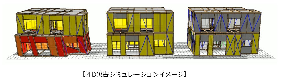 ※3 木造住宅倒壊解析ソフトウェア「wallstat」(京都大学生存圏研究所の中川准教授が開発)を用いた独自地震波の「繰り返し地震」を与えるシミュレーションを指します。3次元の仮想空間に再現した建物モデルに地震波を加え、「時間軸」による変化も含めて評価するものです。