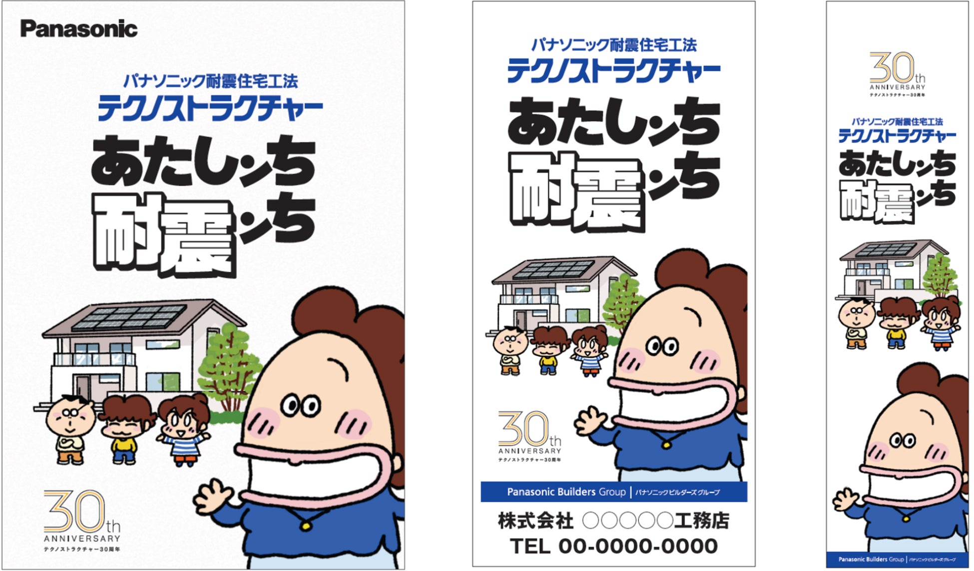テクノストラクチャーの家を提供するのは、全国に約350社のパナソニック ビルダーズ グループ加盟店(以下、加盟店)です。加盟店がテクノストラクチャーの家を建設する現場などに設置する養生シート(足場などに設置するシート状看板)や、のぼりも「あたしンち」のキャラクター仕様で展開し、お客様への認知向上を図ります。