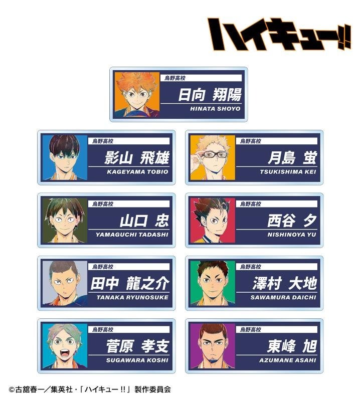 日向翔陽、影山飛雄、月島 蛍、山口 忠、西谷 夕、田中龍之介、澤村大地、菅原孝支、東峰 旭のビジュアルを新たなタッチで魅力的に表現し、アクリルネームプレートに仕上げました。