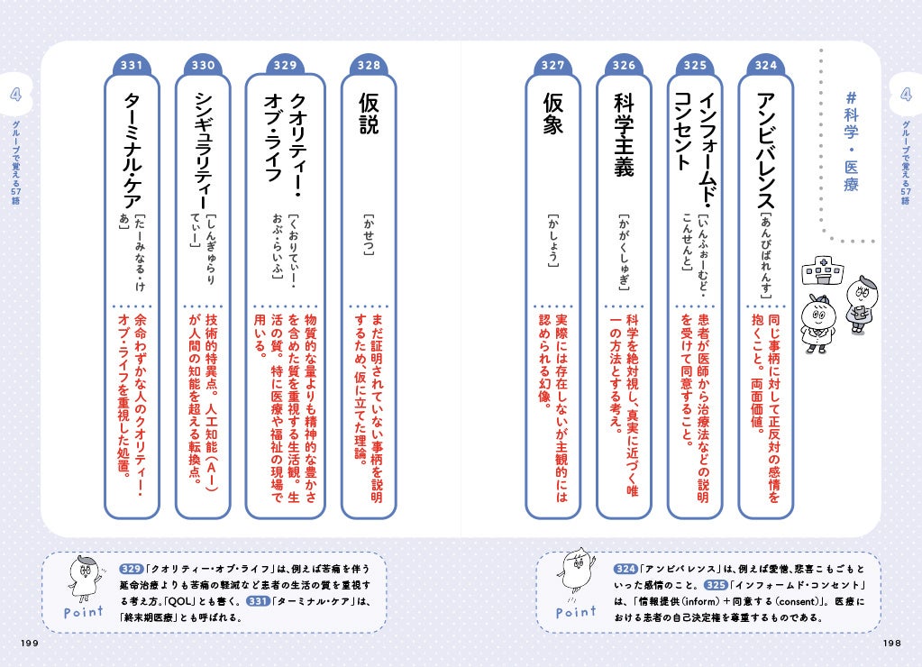 セットやグループで理解したい単語については、複数をまとめて掲載したページも。「#科学・医療」「#情報・メディア」などといった「#(ハッシュタグ)」でグルーピングされているので、関連する単語をテンポよく覚えられます。