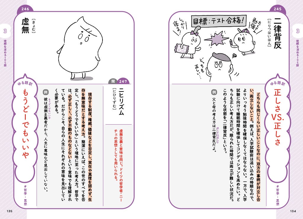 現代文で頻出の単語に、ニュアンスを大づかみできるカジュアルなひとこと説明(=ゆる語訳)と、記憶に残りやすいイメージイラストを添えています。現代文に苦手意識がある人でも、ゆるく、楽しく、現代文単語を理解できる一冊を目指しました。