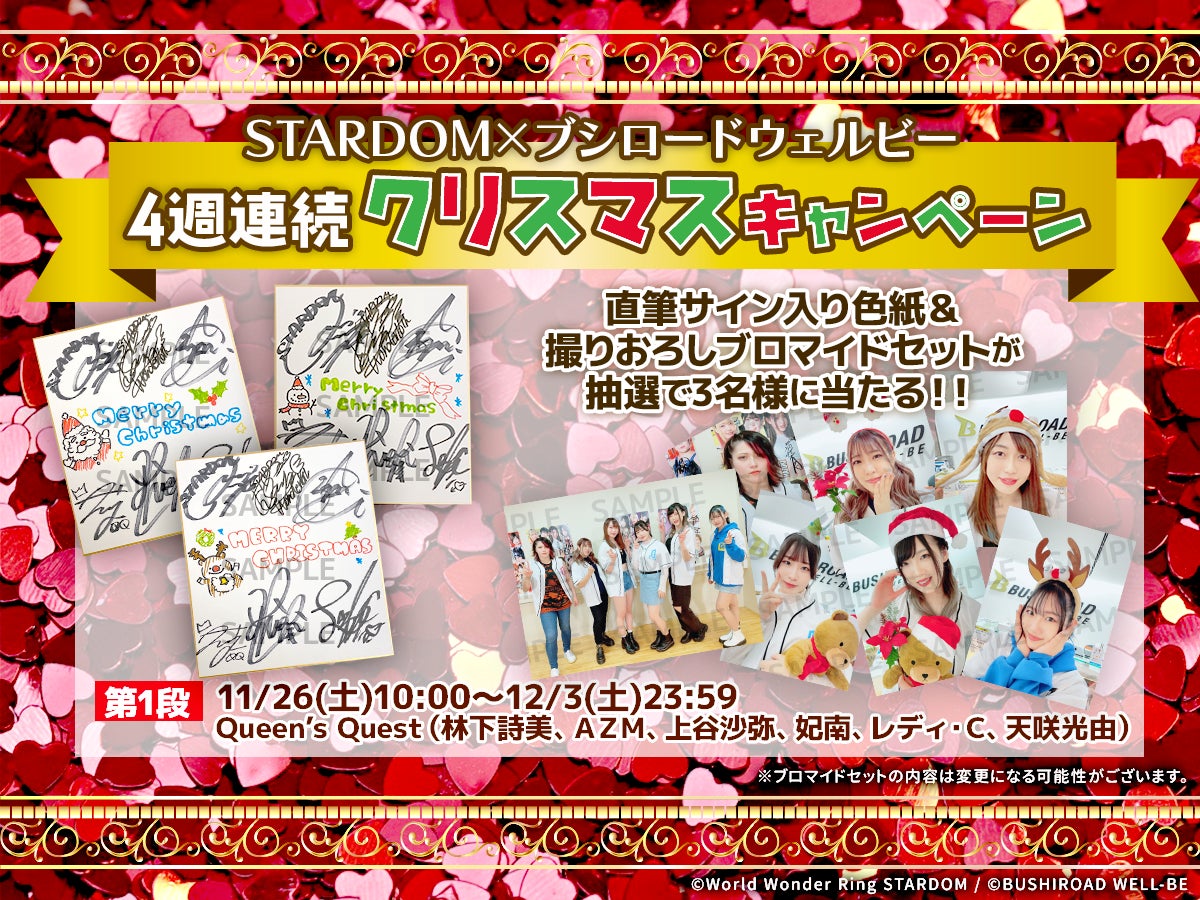 株式会社ブシロード(本社:東京都中野区、代表取締役社長:木谷高明)のグループ会社である株式会社ブシロードウェルビー(本社:東京都中野区、代表取締役社長:大場隆志)より、同グループ会社である株式会社ブシロードファイト(本社:東京都中野区、代表取締役社長:原田克彦)が運営する女子プロレス『スターダム』とのコラボ企画として、所属選手たちの直筆サイン入り色紙&撮りおろしブロマイドセットが抽選で当たる4週連続Xmasキャンペーンを実施することをお知らせいたします。