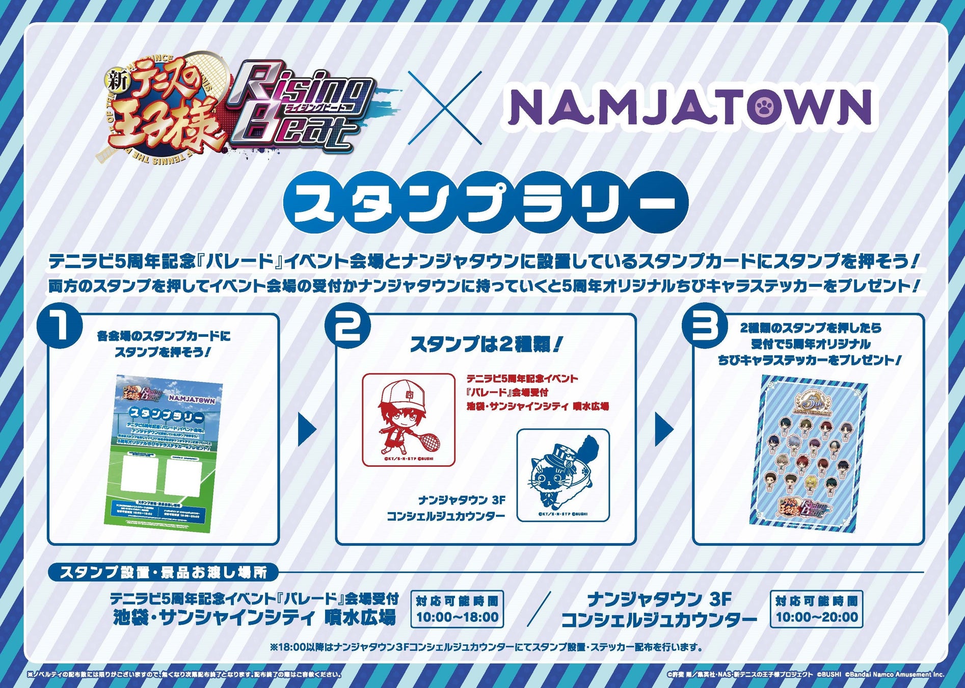 テニラビ5周年記念イベント『パレード』会場とナンジャタウンに設置しているスタンプカードにスタンプを押して5周年オリジナルちびキャラステッカーをGETしよう!