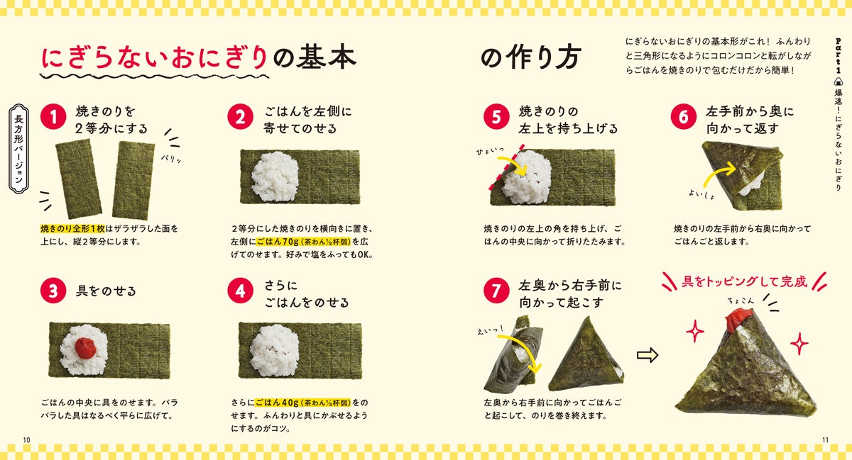 基本の作り方は、焼きのりを広げて、ごはんと好みの具をのせ、ふわっとくるんで形を整えるだけ。特別な道具も、難しいテクニックも必要ありません。写真入りで手順をわかりやすく解説しているので、誰でも失敗することなく、専門店みたいな絶品おにぎりを作れます。アツアツの作りたても最高ですが、ギュッとにぎらないからこそ、冷めてもふんわり食感をキープできるのもうれしいところ。