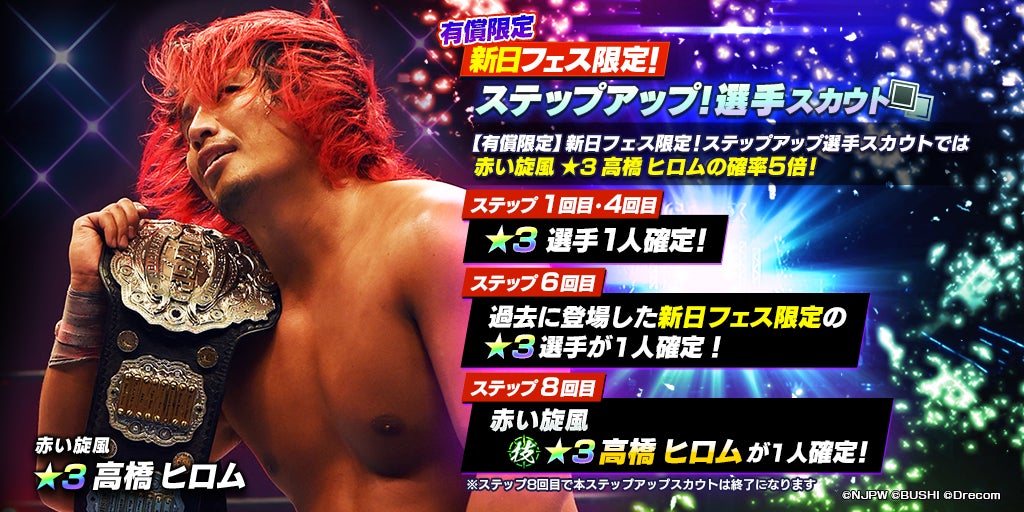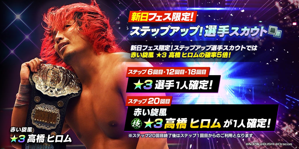- 新★3選手「[赤い旋風]高橋ヒロム」が登場する新日フェス限定ステップアップ選手スカウトを開催!
