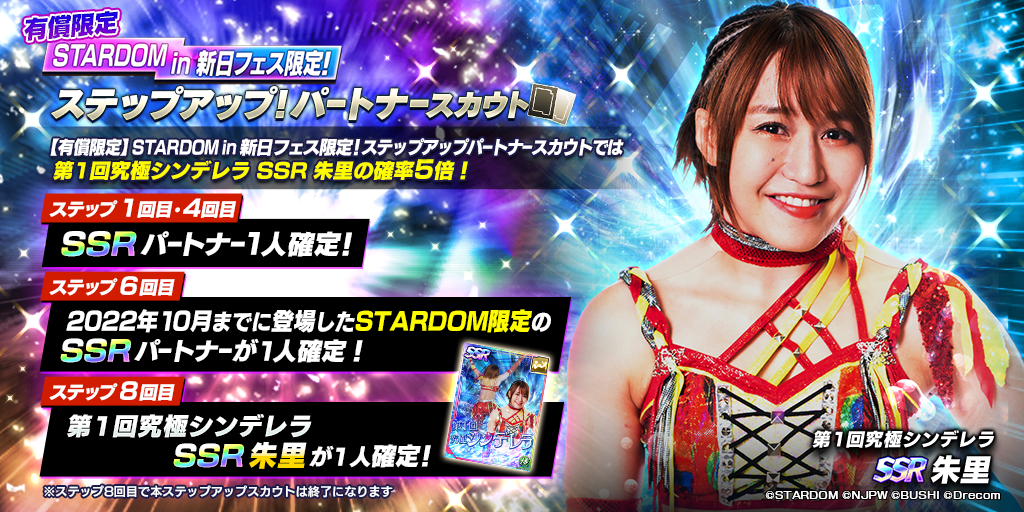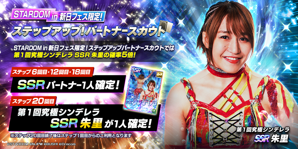- YouTube企画「第1回究極シンデレラトーナメント」を制した朱里選手を記念し、新SSRパートナー「[第1回究極シンデレラ]朱里」が登場するSTARDOM in 新日フェス限定ステップアップパートナースカウトを開催!