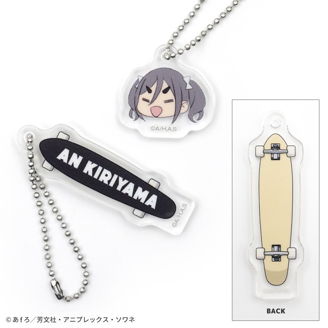 ワンポイントとして、アンとスケボーのアクリルキーホルダーを付属。