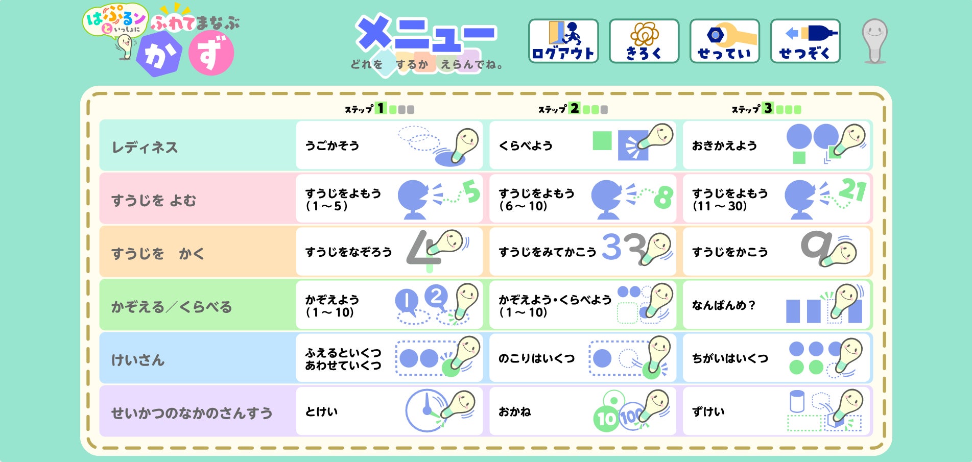 学習の領域は、「レディネス」「すうじをよむ」「すうじをかく」「かぞえる くらべる」「けいさん」「せいかつのなかのさんすう」で、子どもの発達段階に合わせて組み合わせ、学ぶことができます。