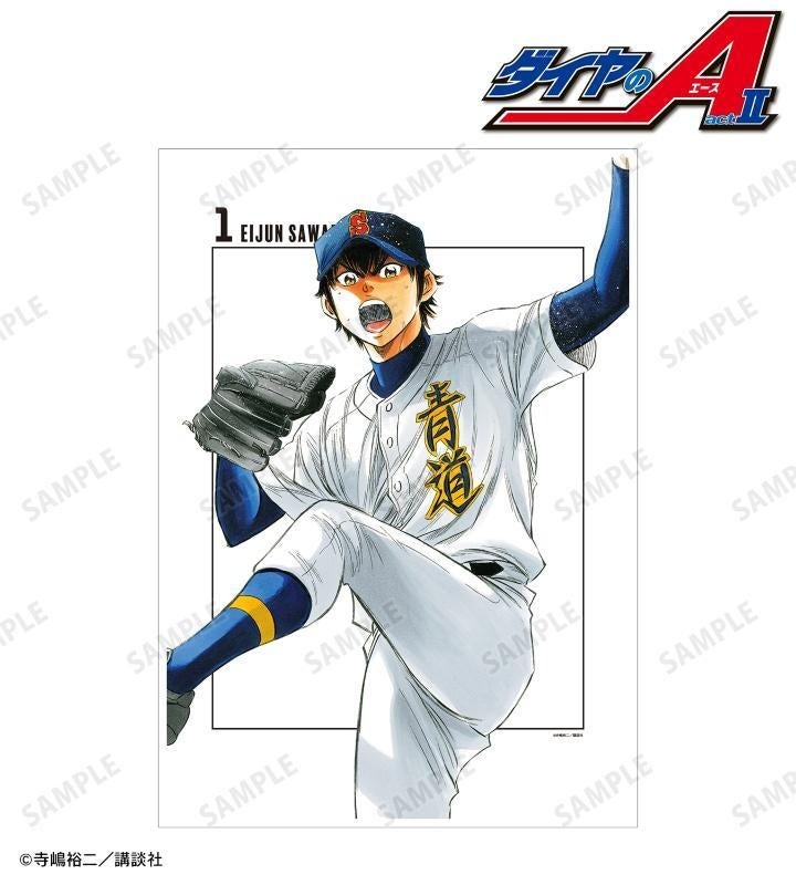 沢村栄純、御幸一也、降谷暁、倉持洋一、小湊春市、奥村光舟、由井薫、成宮鳴、轟雷市のカラーイラスト、キャラクター名、背番号をA3サイズのマット加工されたポスターに仕上げました。